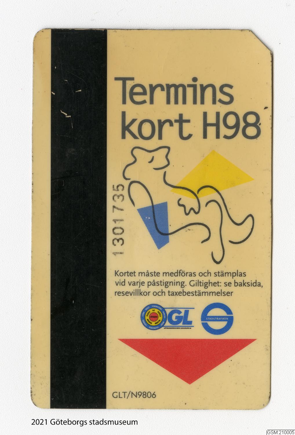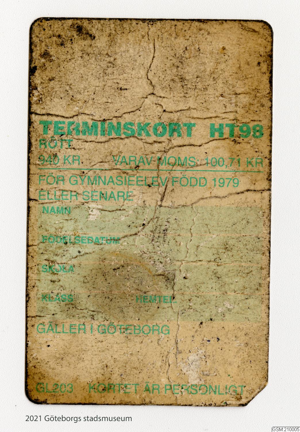 Ett terminskort för HT98 från Västtrafik. Märkt "Rött 940 kr För gymnasielev född 1979 eller senare. Gäller i Göteborg".