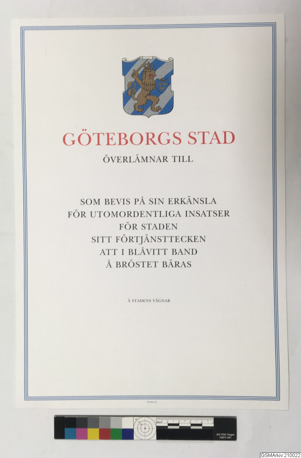 - medaljbrev/diplom som tilldelas samman med Göteborgs stads förtjänsttecken som bevis på innehavet av detta hederstecken/medalj. Stadens förtjänsttecken intiftades den 4 juni 1948 och utdelades som en bärbar medalj t o m år 2006 därefter endast som en pin i två storlekar. Denna sorts diplom trycktes av Rundqvists Boktryckeri i Göteborg för stadens räkning från 1950-talet till ca år 2000, variationer finns i vapnets färger över tid annars identiskt under dessa år./ctn