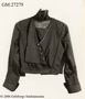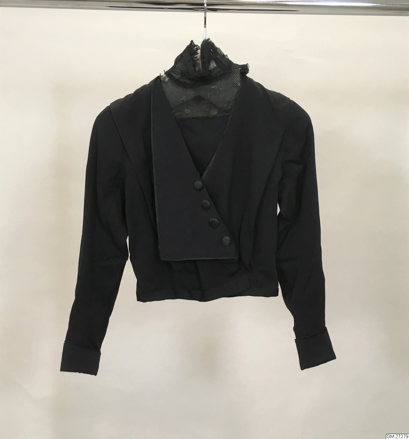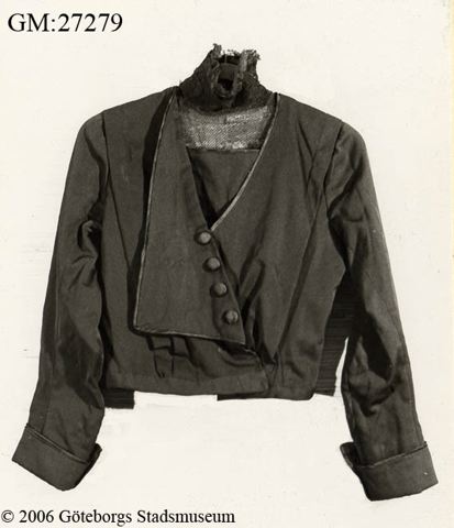 Knäppt framtill med tryckknappar. 4 stycken slagna knappar av svart satäng på innerkanten av kragens enda slag. Svart spetsisättning med hög krage. Lagda veck av yllekypert på axlarna. Långa ärmar med upslag med två svarta knappar på vardera ärmar. I i Ryggstycket två stycken veck på mitten. Beige figurstdd foderliv med ben.