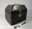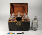 - Schatull som innehåller sex glasflaskor utan innehåll.