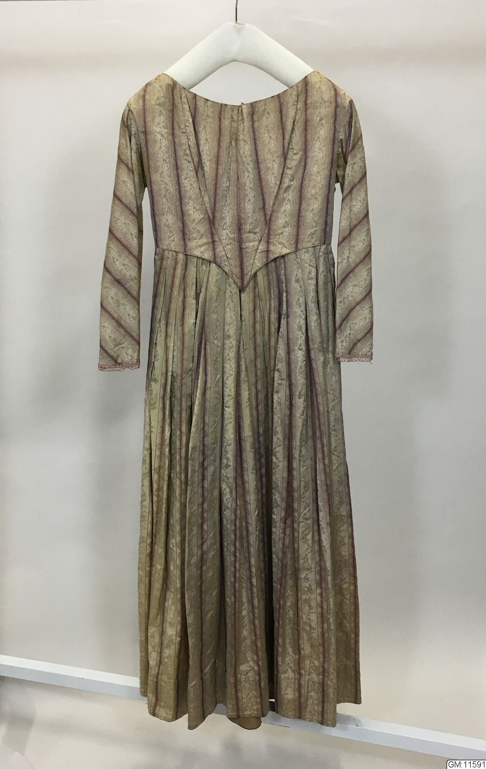 Klädning. Av ljusbrunt, randigt, mönstrat siden (ränder i lila). Livet tätt åtsittande, fast på kjolen (sammansatt av 6 stycken), i snibb framtill, rakt bak. De två framstyckena samt alla kanter försedda med rouleaner av tyget. Den runda urringningen sammandragen med dragsko. Ärmarna långa; smala upptill, vidare nedtill och kantade av en bård av lila silkessnoddar. Livet som knäppes rakt bak med hakar och hyskor, är fodrat med vitt bomullstyg. I livet tvänne insydda fjädrar: en mitt fram och en mitt bak. Kjolen mycket vid, mitt bak tvänne stora grupper med rynkor. Kjolen kantas nertill av en lila snodd. Foderkant nedtill på kjolen av brunt bomullstyg. Längd ca 140 cm. Bredd i midjan 45 cm, kjolens vidd: ca 140 cm