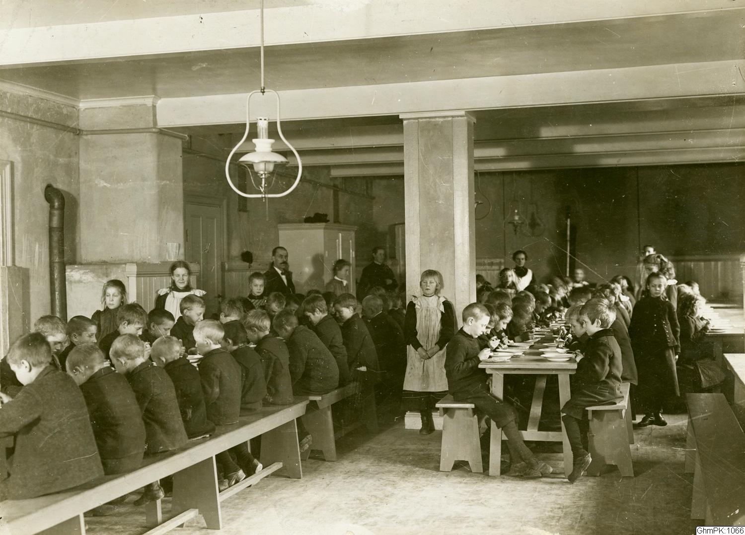 Matssalsinteriör från okänt barnhem/barnhus. ; Barnsbespisning. D.33.222