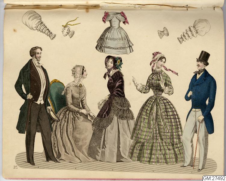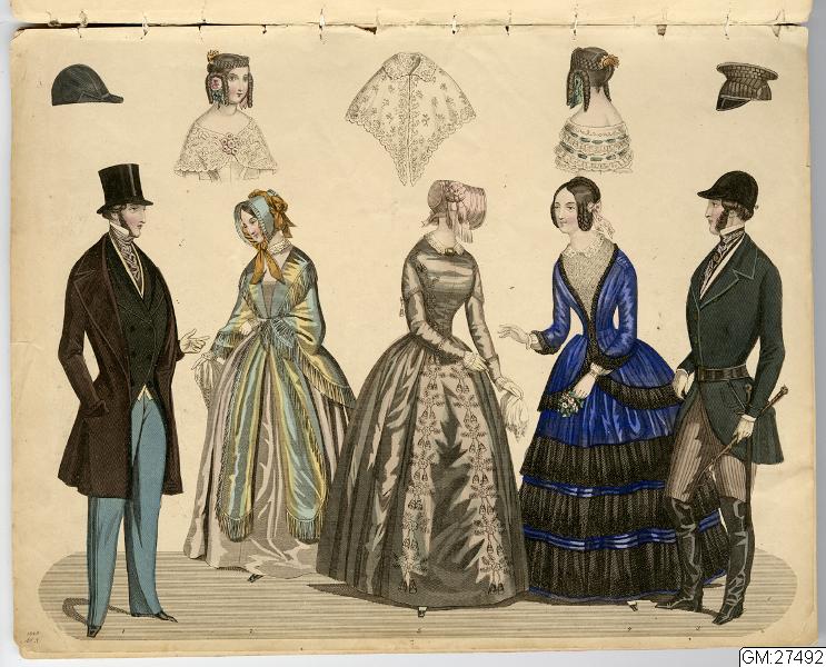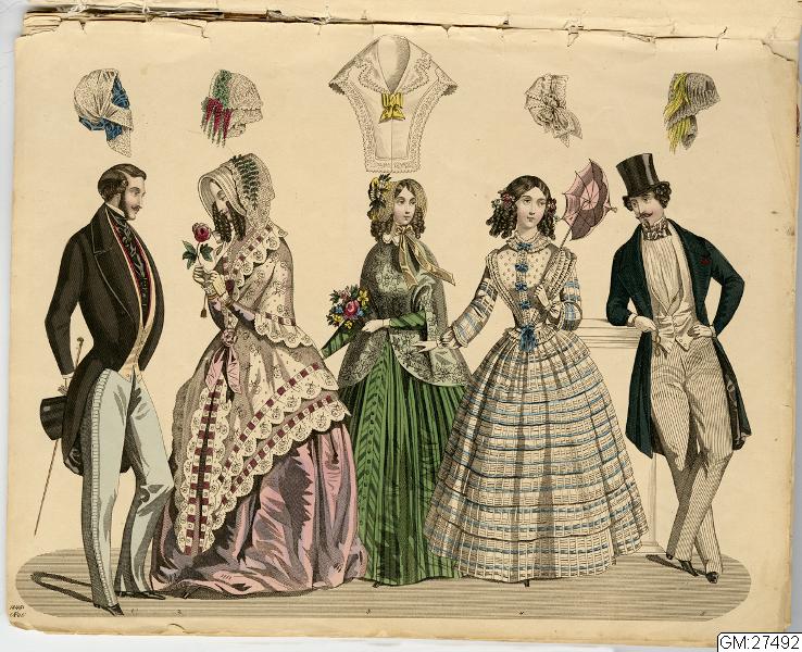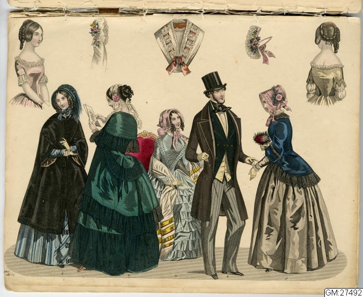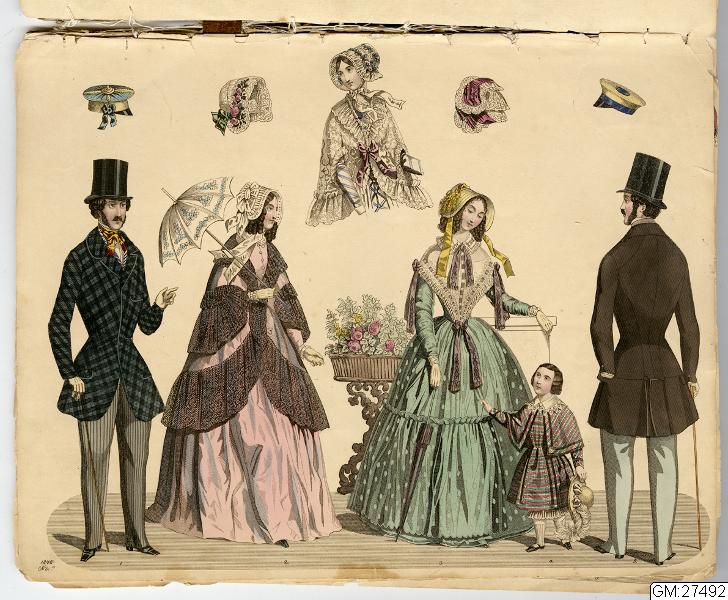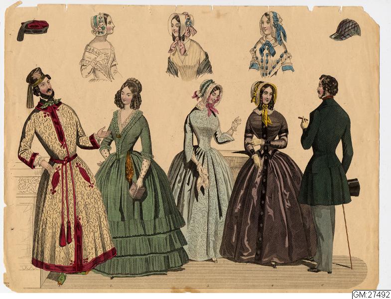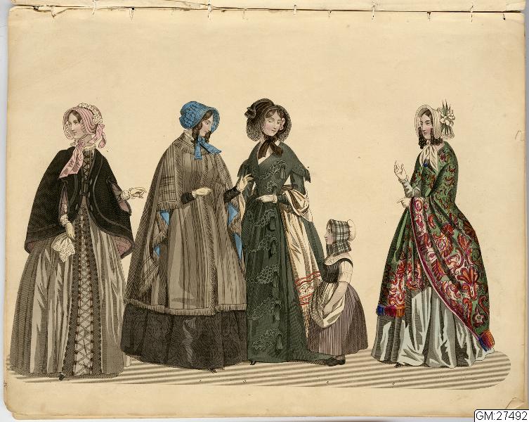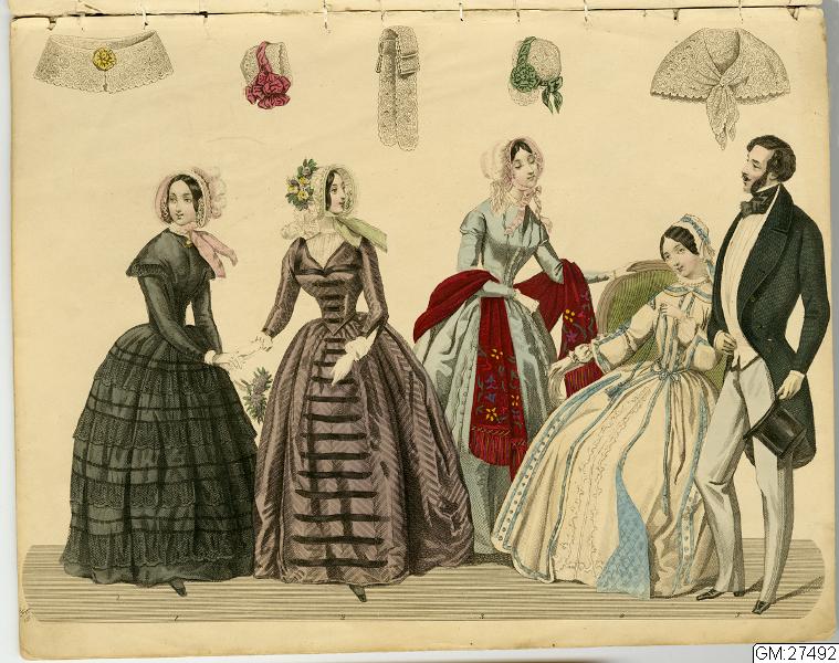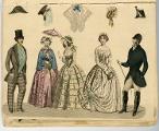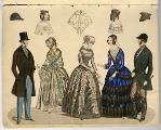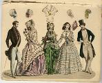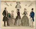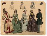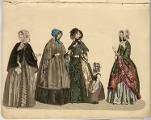 [bild 2]Januari Plansch no 1" 1) Sidenhatt med blommor; kaftan av sammet; sidenklädning med snedrat lif, halflånga snörade ärmar och hvita underärmar; kjorteln framtill prydd med snörmakeriarbete och guldknappar. 2) Sidenhatt utan nackskärm, på sidorna klädd med atlasband; Joways-kappa af cachemir, garnerad med fransar ; moire-klädning. 3) Pamelahatt af sammet med svarta spetsaroch sammetsremsor; sidenklädning med till hälften urringat lif och åtsittande ärmar, snörmakerier och tofsar; långshawl af cachemir. 4) kostym för en liten flicka. 5) Atlashatt med en liten blomsterqvast vid sidan; klädning af halfsiden; Modernaste shawl.