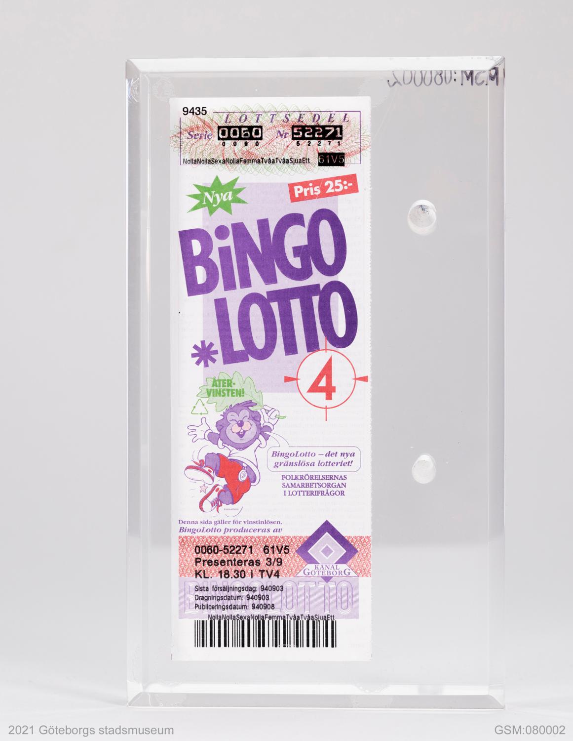En ny bil, färsk kyckling eller biljetter till friidrotts-VM i Göteborg? Man kan undra vilken vinst som lockade mest för personen som spelade på denna lott den 3 september 1994. Kanske var det gott nog att det göteborgska dansbandet Arvingarna spelade?