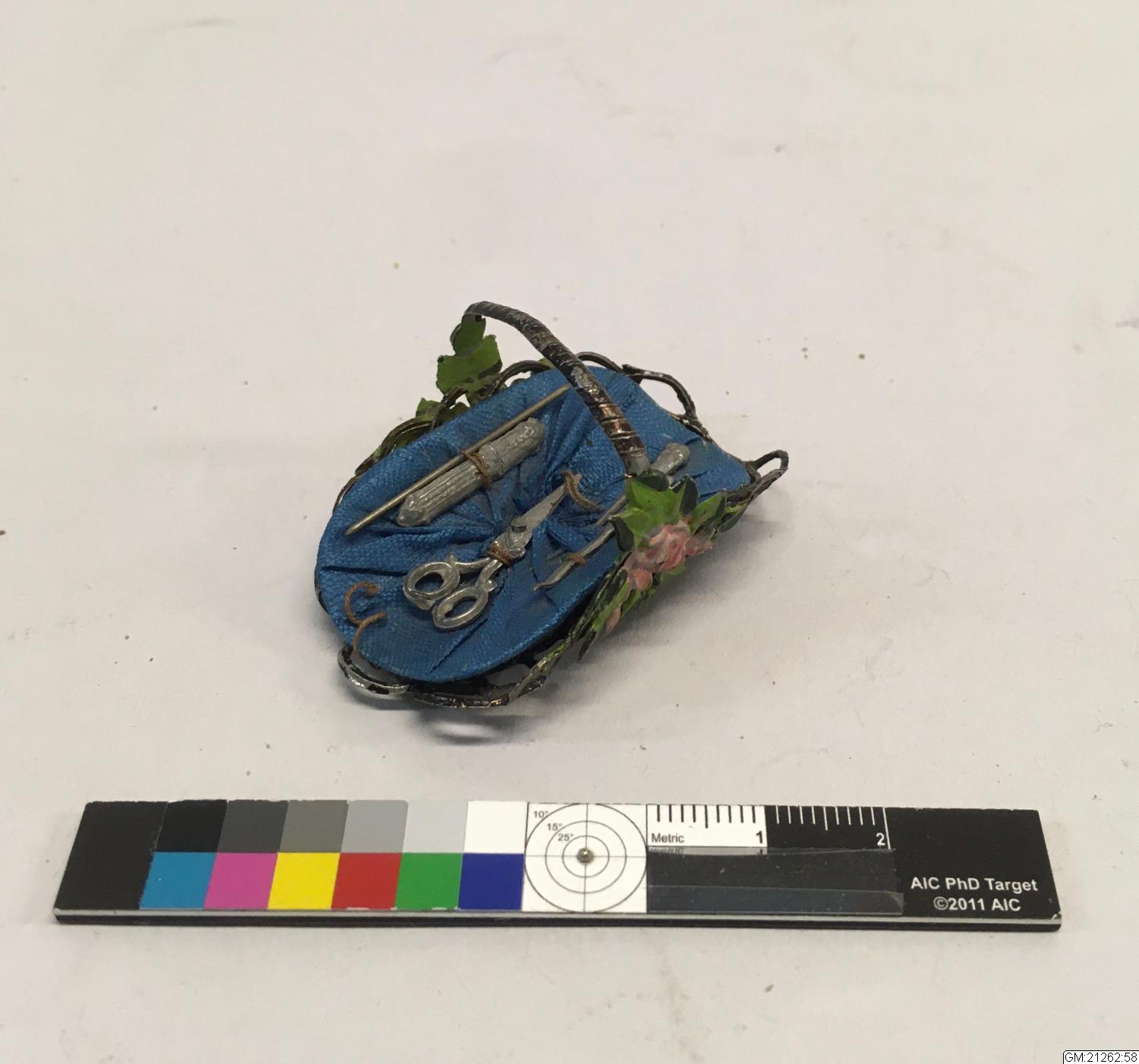 Sykorg av metall med insats med fastsydda sybehör såsom sax, nål, pryl mm. (:a-b).