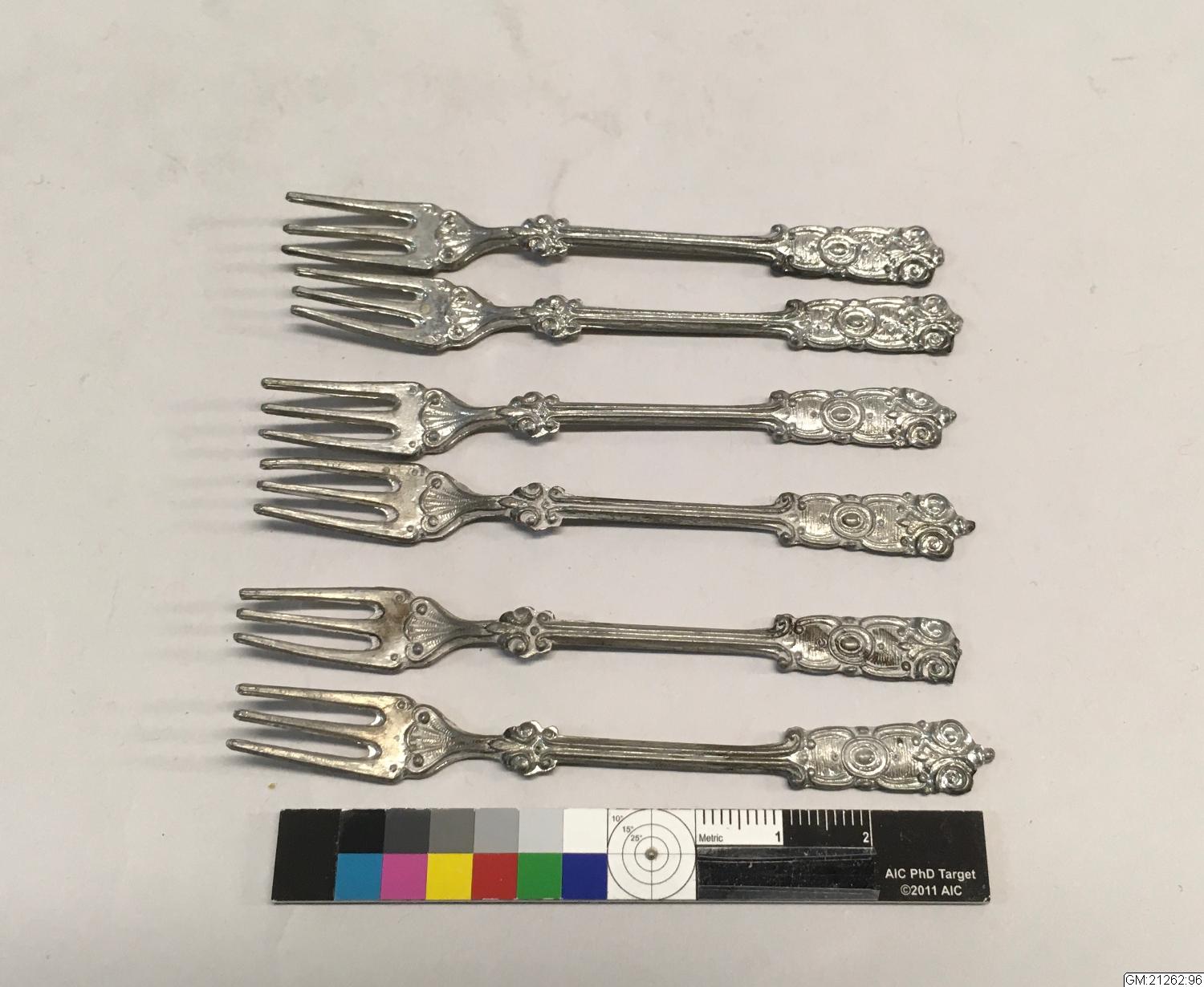 - 6 st gafflar av tenn med ornerade skaft (:a-f)