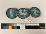 Tre knappar med ram och baksida i metall med blåvit dekor av blyertsteckning och vattenfärg under glas.