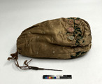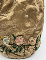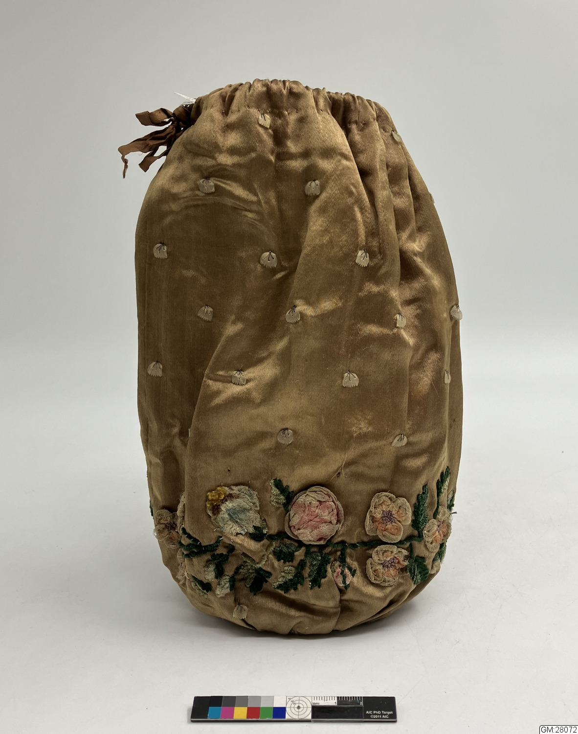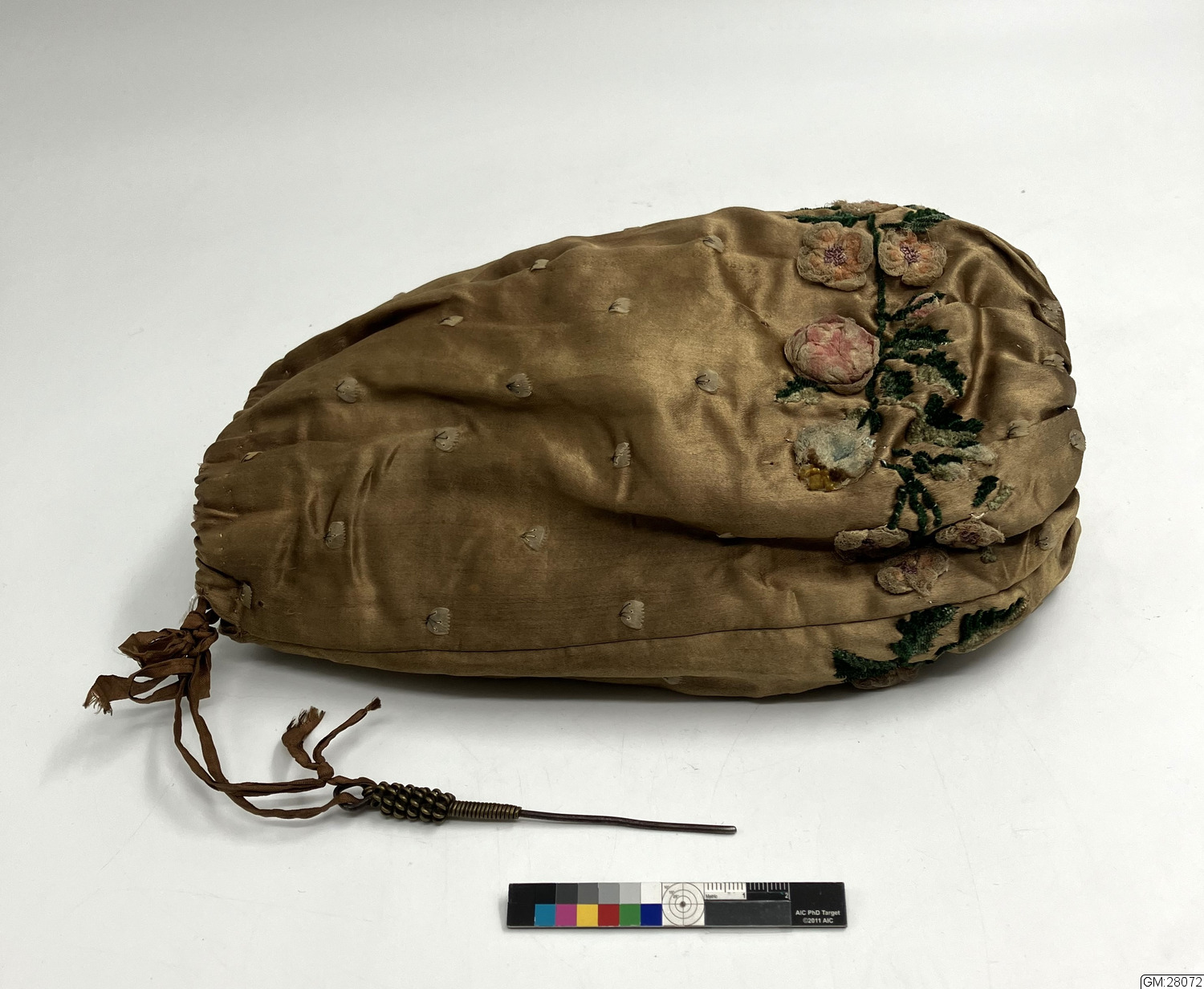Ridikyl av ljusbrunt siden med foder i rött skinn. Väskan är i påsmodell med platt botten och dragsko upptill, vidhängande kläpp i metall. Broderi, delvis i applikation, som bildar en blomstergirlang i påsens nederkant. Påsydda fiskfjällspaljetter spridda över väskan.
