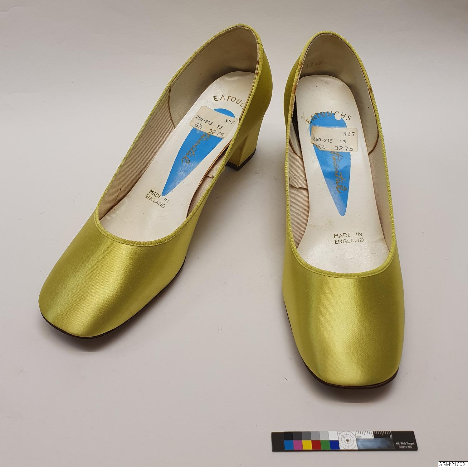 Skorna är specialbeställda och köptes som vita sidenskor som färgades in i en färg som bestämdes av kunden. Dessa användes till ensemblen GSM:210016. Skorna var ömtåliga och blev ganska fort smutsiga, särskilt vid middagar med dans när herrarnas skor var nyputsade.