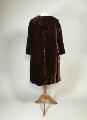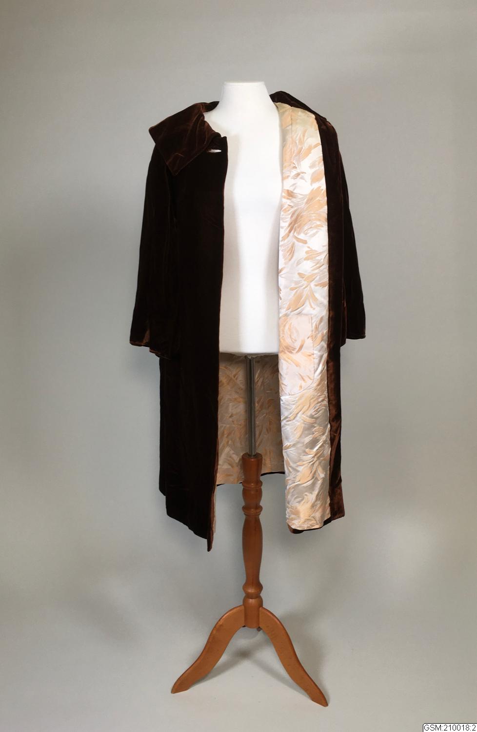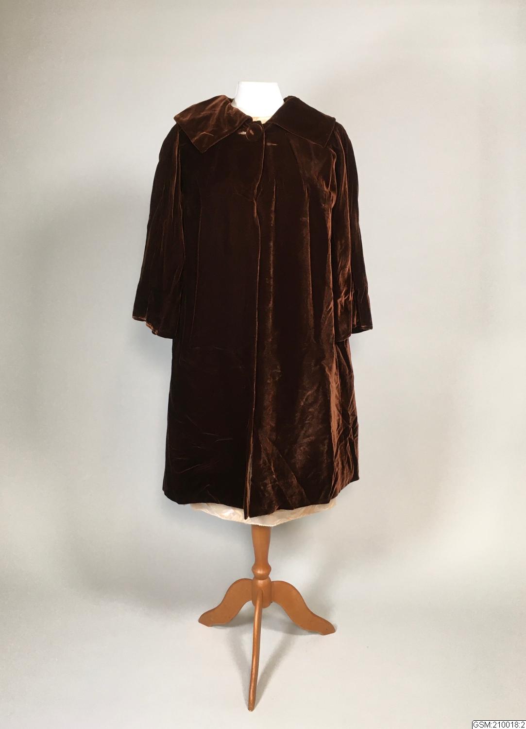 - Kappa i brun sammet med foder av rosa mönstervävt siden. Kappan är knälång och har en stor utanpåliggande krage. Utanpåliggande innerficka på vänster framstycke. Knäppning med en stor klädd knapp i halsen.