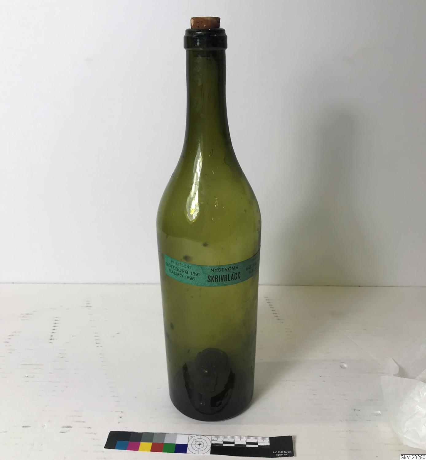 bläckflaska, 1 liter, grönt glas med krok bevarad, etikett, "Nyströms skrivbläck", från ca år 1900.