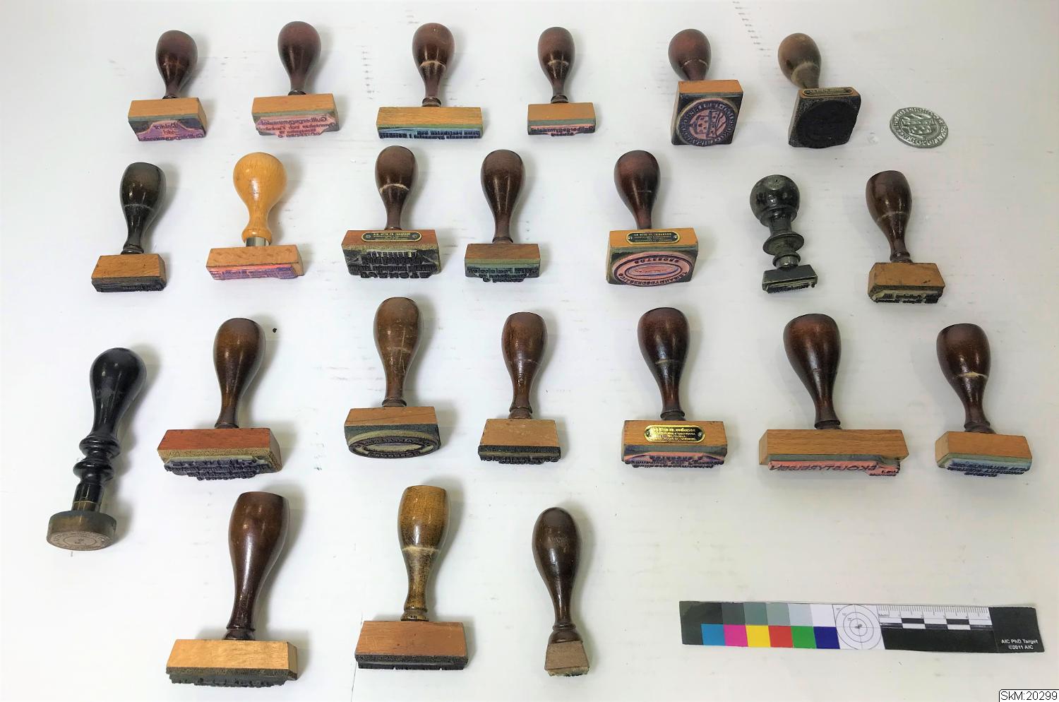 två stämplar från Göteborgs Skolmuseum, med vilka museet stämplade sina föremål vid inmärkningen i samlingen.
