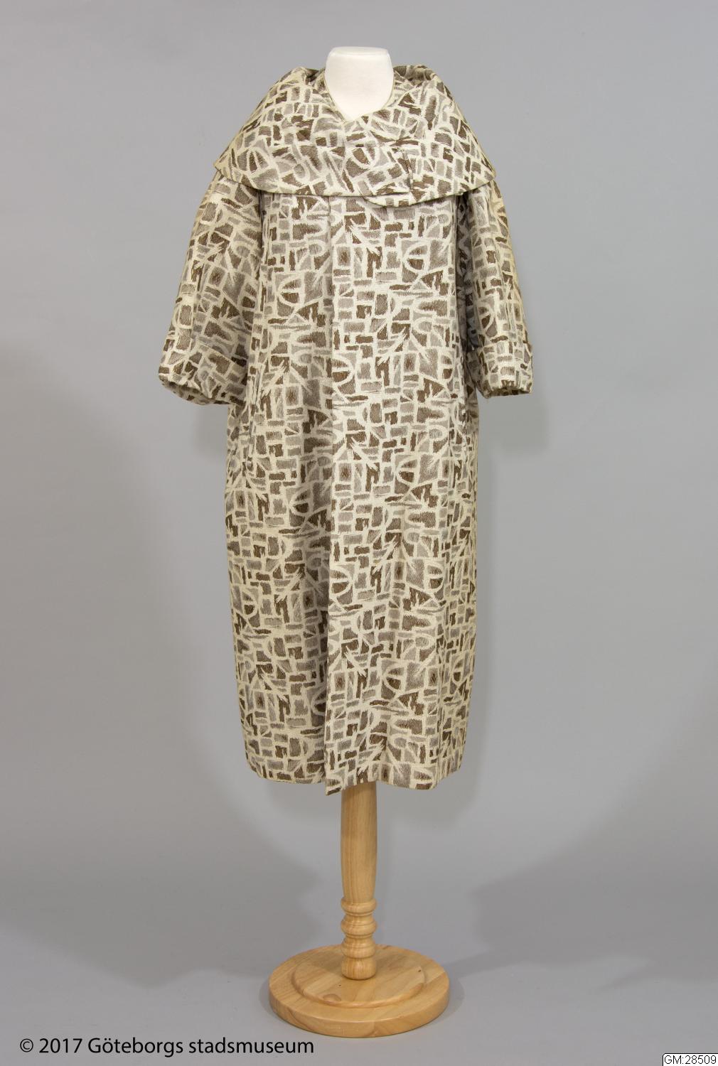 Damkappa, sommarkappa av brunmönstrad vit bomullsvara med brunt satängfoder. Rak modell utan knäppning, stor krage med knapphål, vida ärmar. Firmamärke: "Valerius Hansson". Har tillhört givaren. Längd: 105 cm, ärmlängd: 45 cm, vidd: 170 cm.
