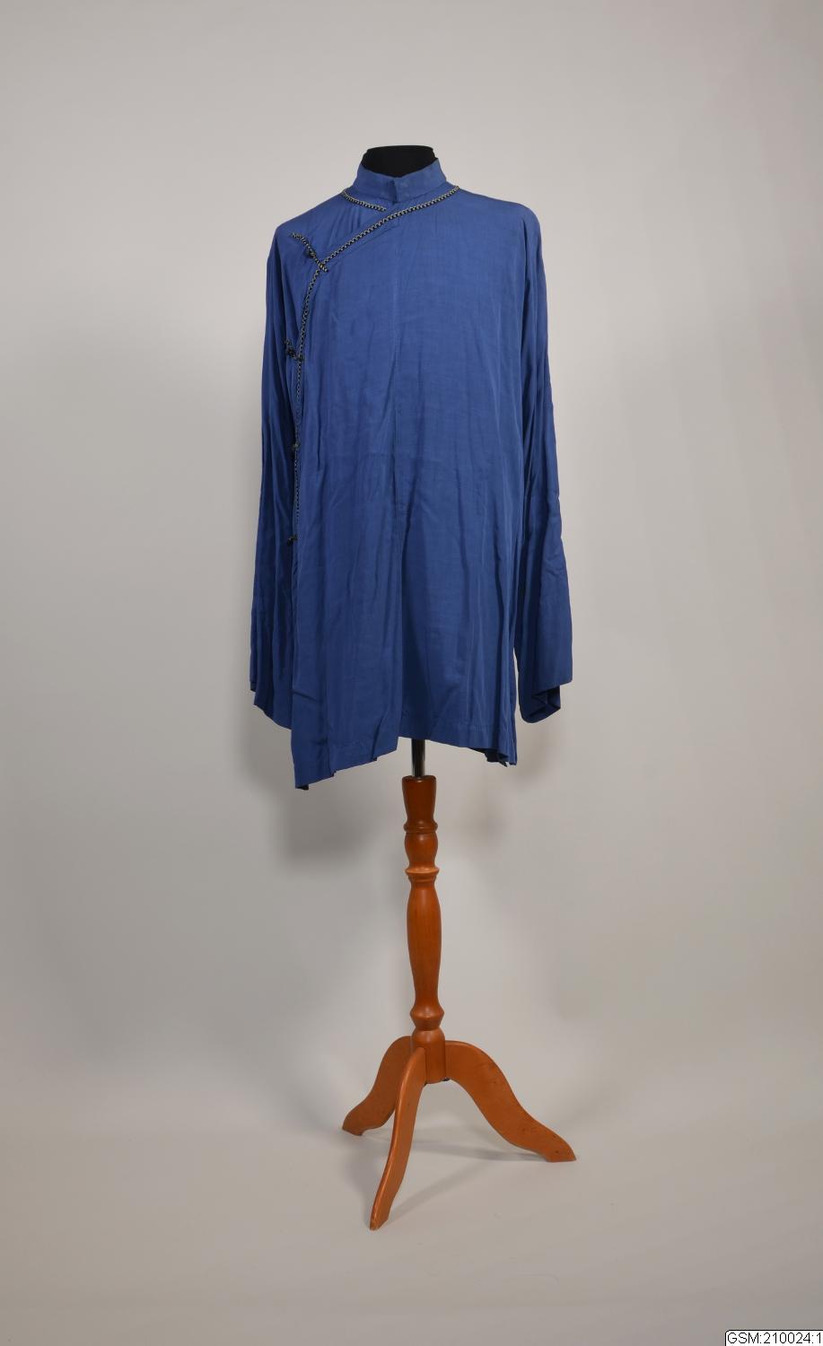 - Kinainspirerad jacka tillhörande teaterkostym. Vid, något utstående modell där ärmar och bål är skurna i ett (s.k. kimonoskärning), slitsar nedtill i varje sida. Långa vida ärmar med rakt avslut. Framstyckena går omlott med knäpppning på höger axel och sida. Knäppningen dekoreras med dekorband som även bildar fyra sydda öglor och knappar. Ståndkrage, 3,5 cm bred.