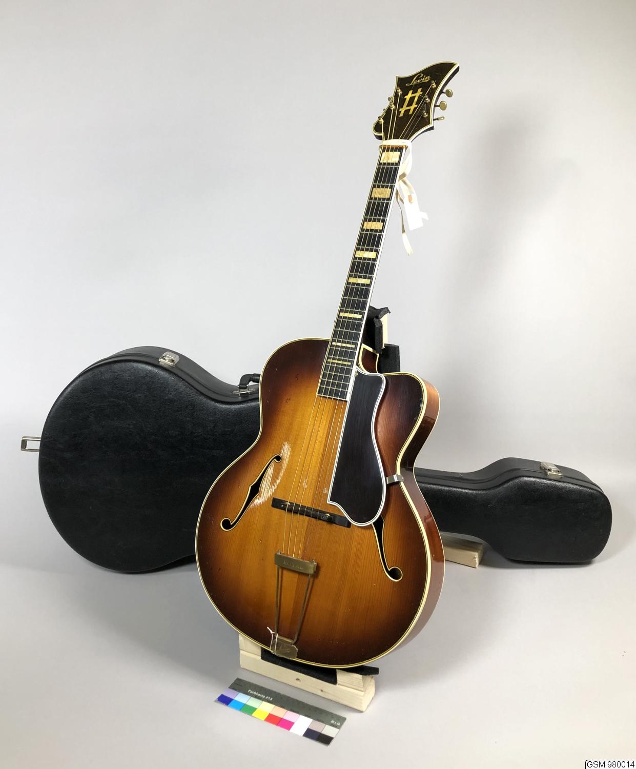 Gitarr: lock, sarg och halsen av lackad mahogny. Välvt lock av lackad gran med mörkare toning runtom liksom den välvda botten. Greppbräda av ebenholtz (?) med 20 metallband och med 8 bandmarkeringar av pärlemorimiterade plast. Fastlimmat, reglerbart stall av ebenholtz (?). Ljust plastförstärkning runtom korpus på båda sidor och förövrigt runt hela instrumentet, inklusive f-hålen.Stränghållare och stämskruvar av gulmetall. På skruvlådan en stegliknande dekoration samt namnet Levin (med skrivstil) inlagt med samma typ av plast som på greppbrädan.