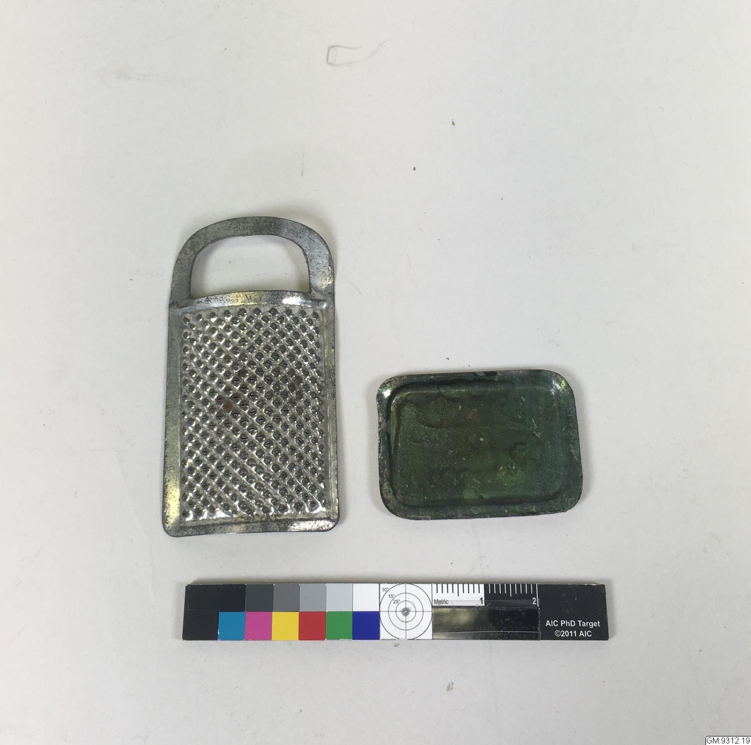 Ett rivjärn och en bricka i bleck, för dockskåp.