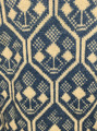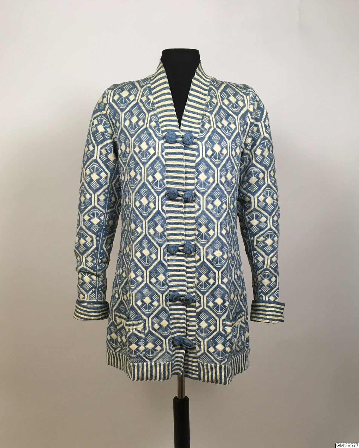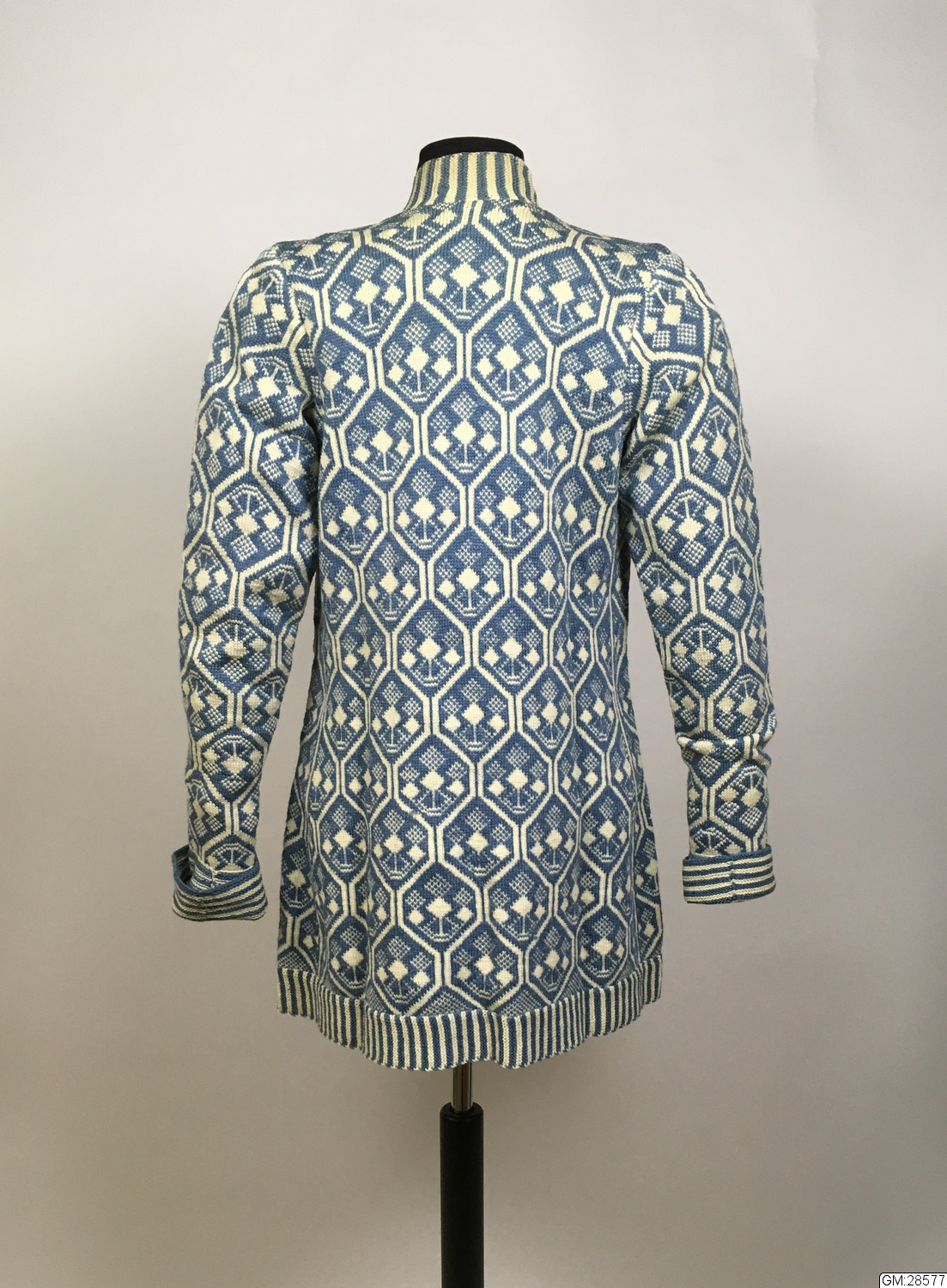 - Kofta stickad i bingestickning med ullgarn i färgerna ljusblått och naturvitt. Halskant, ärmmuddar och nederkant är randigt resårstickade och resten av koftan är mönsterstickad i Bjärbomönster. Koftan har en ficka på vardera framstycke och knäpps med 5 runda dubbelknappar.