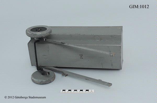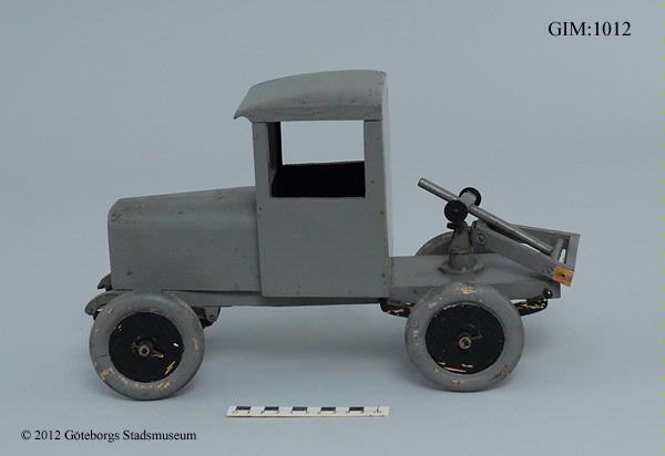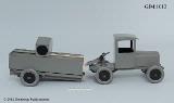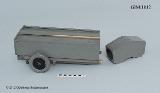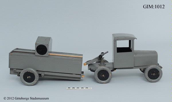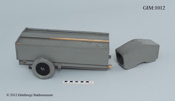 - modell av vagn för dammfri tömning samt dragande del "Ormen Långe" En transportbilsmodell i gråmålat trä bestående av tre delar. En dragbil, ett släp på två hjul samt en "kloss" föreställande ett tillbehör till släpet.
