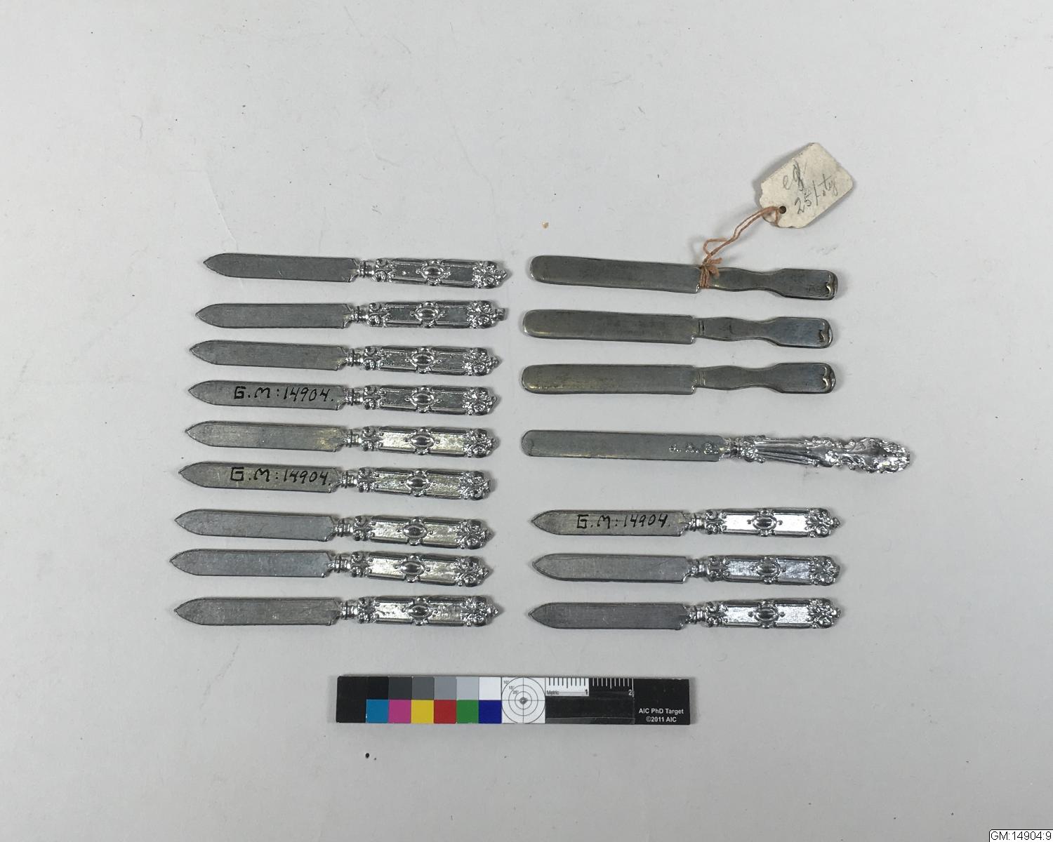16 st knivar i tenn tillhörande bestick för dockskåp.