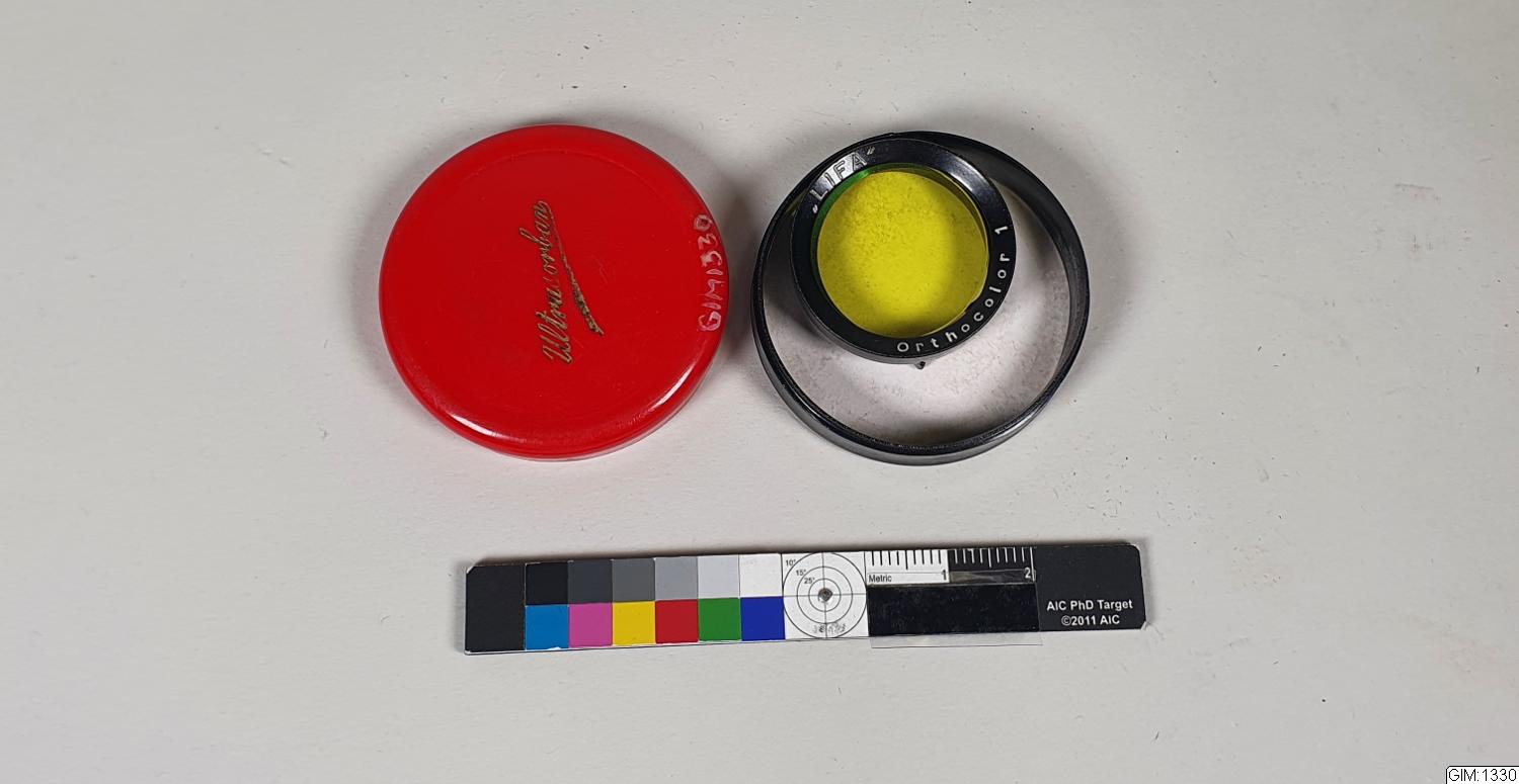 Gul filter. Ligger i en röd/svart plastburk med texten: Utrasorban.