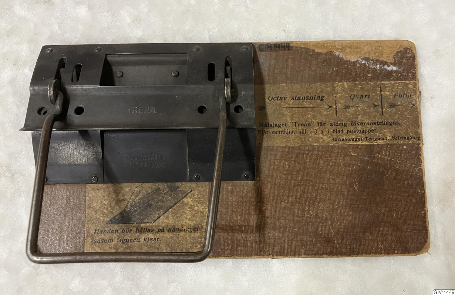 Slå samtidigt hål i 3 eller 4 blad postpapper. Påklistrad bruksanvisning.