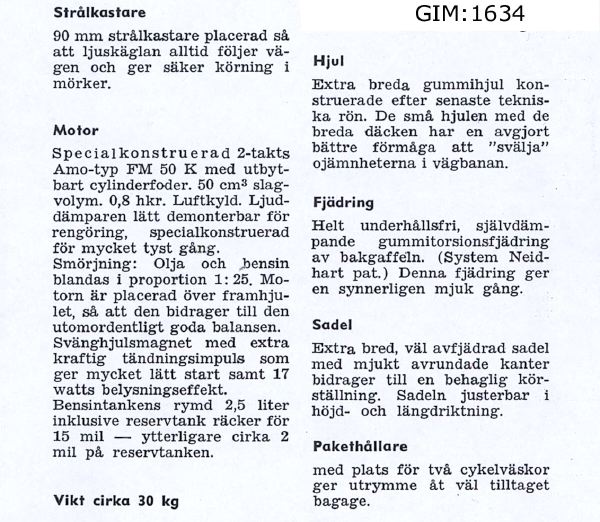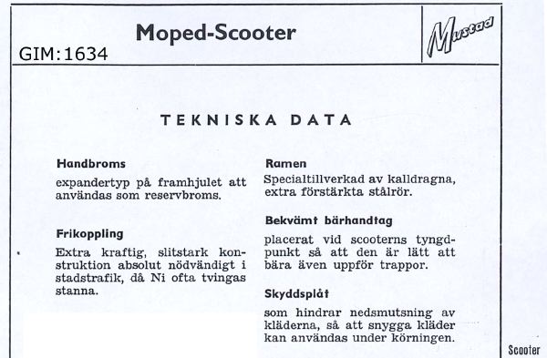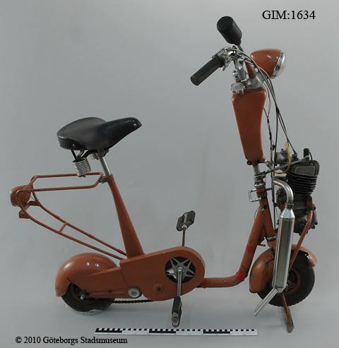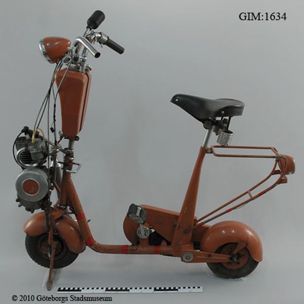 - Rosamålad scoter 47,9 cc med mycket små hjul. Tank och motor sitter ovanför framhjulet. Tändkabel plasthölje trasigt. Höger fram stänkskärm trasig. Bränslepump -namn "Palace" Sadel märkt " Wittkop " Sprickor bak på stänkskärm.