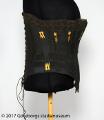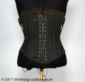 Från katalogkort: Snörliv av svart och vitt vaxat tyg. Stickningar med partier med iträdda ben. Spets nedtill. Snörning mitt bak. Hakar och hyskor framtill. Längd 75 cm.