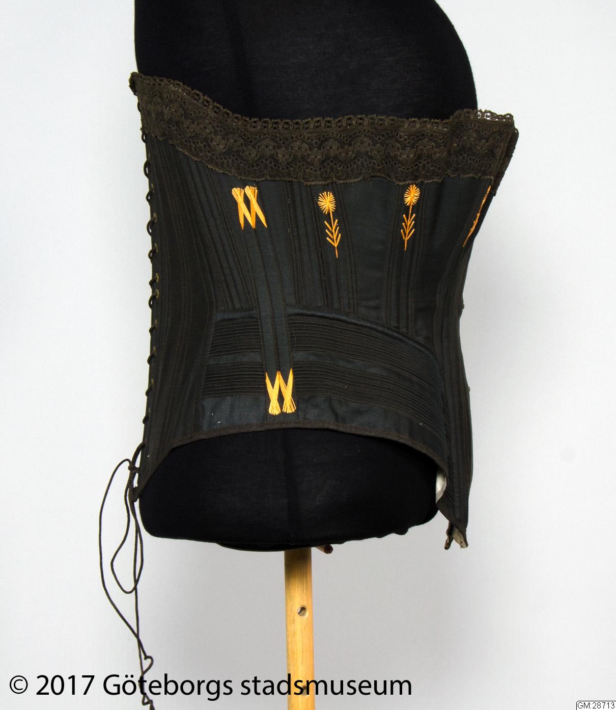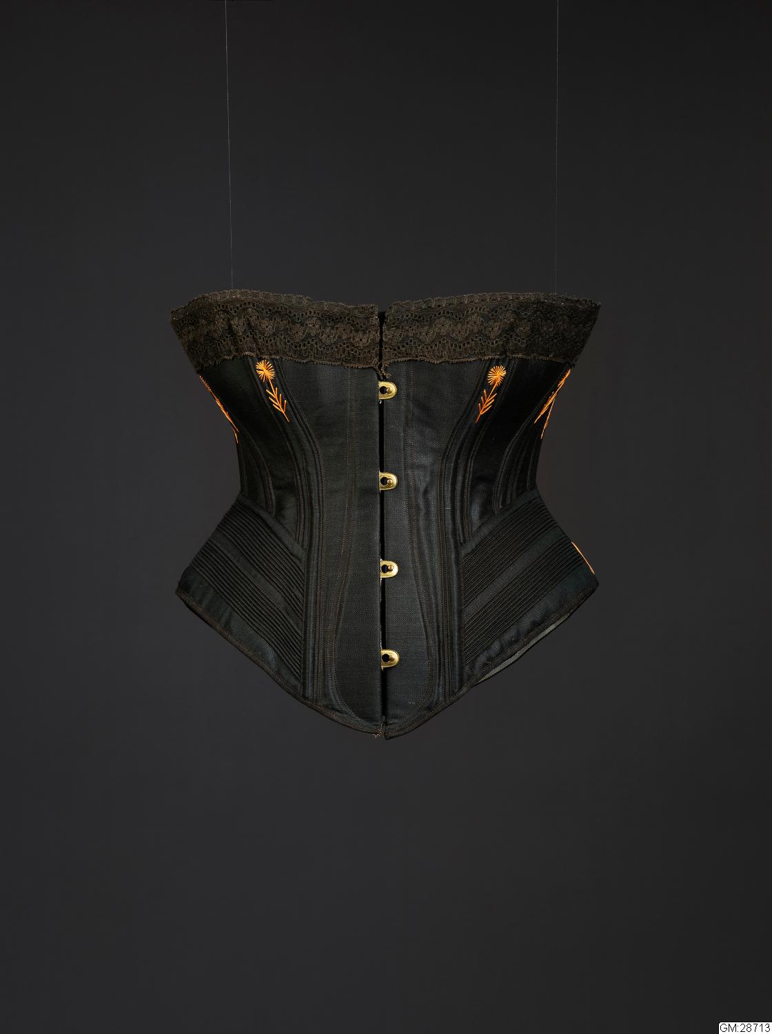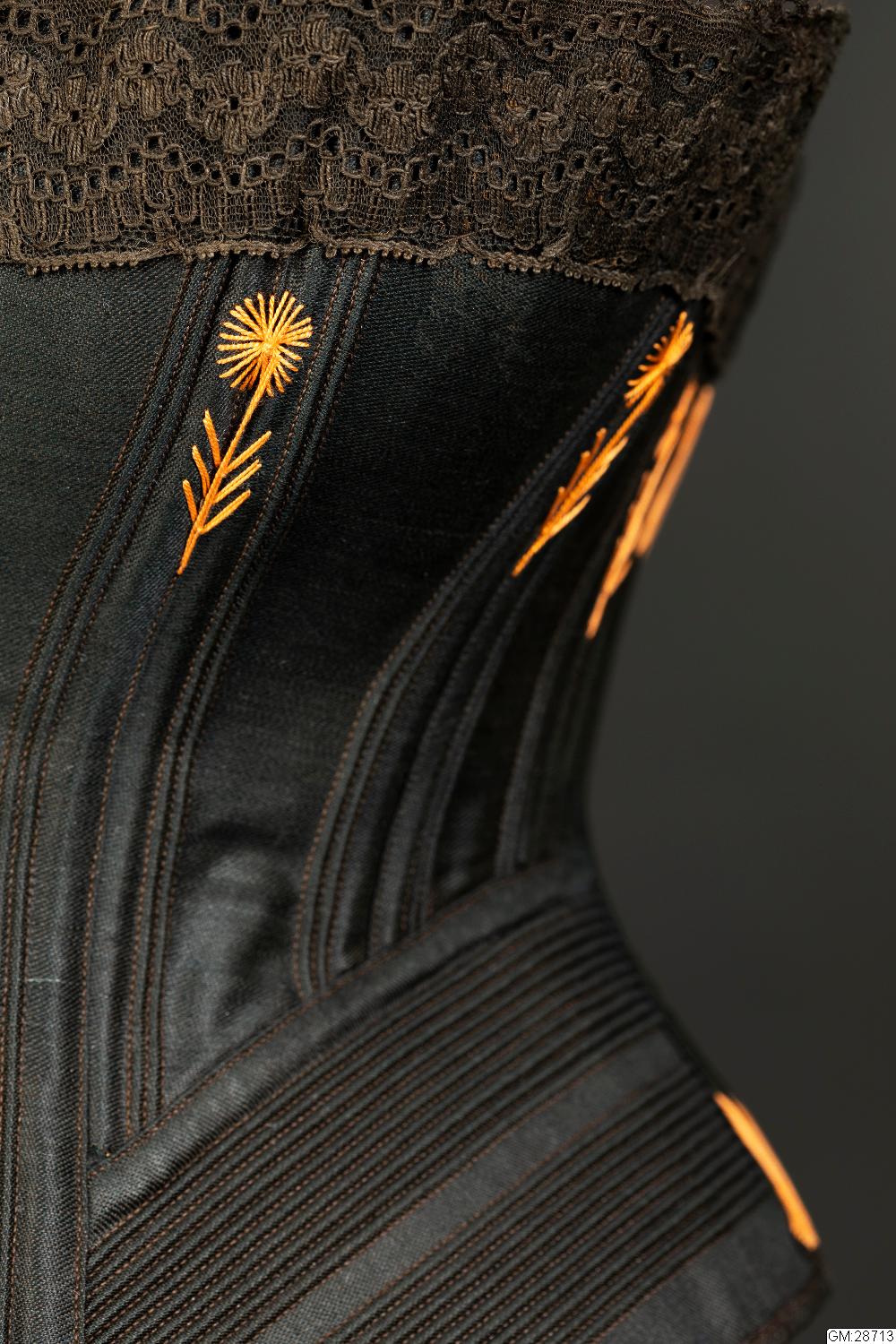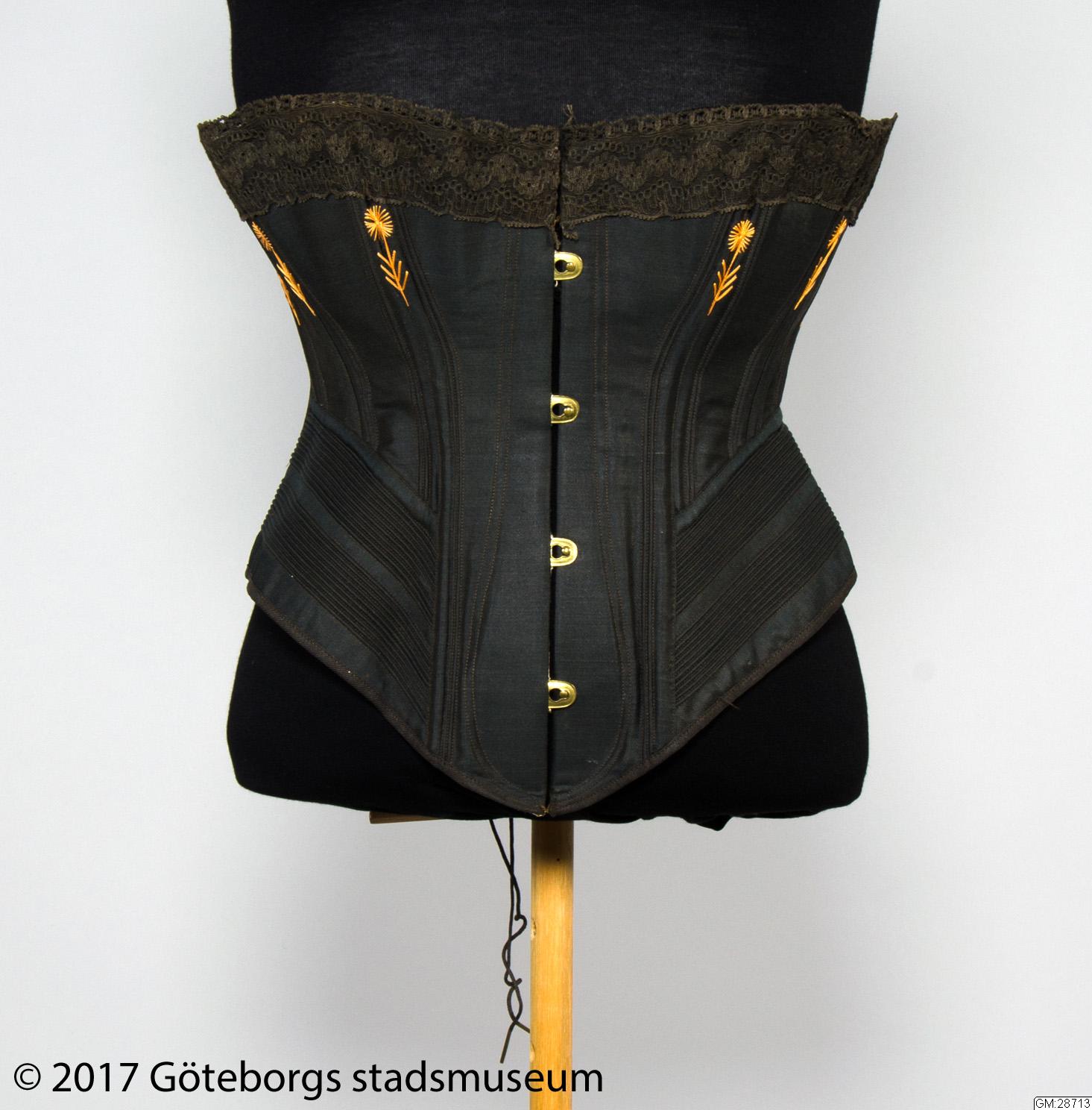 Korsett i svart bomull med broderier i orange och påsydd svart spets upptill. Öppningsbar planchett mitt fram och snörning i ryggen. Korsetten har stort omfång.