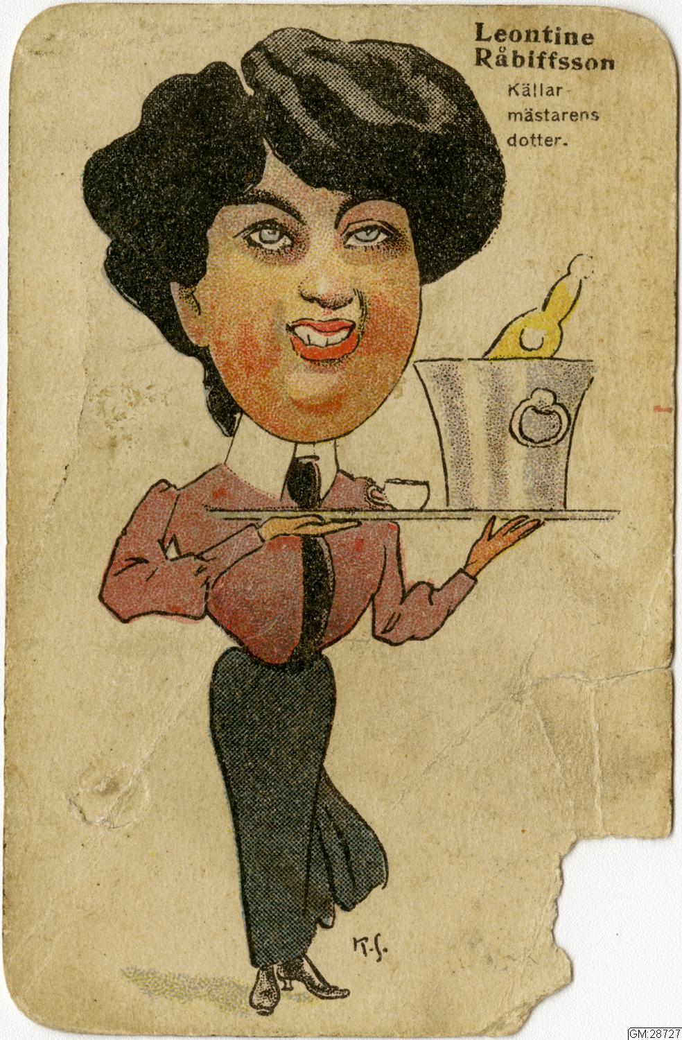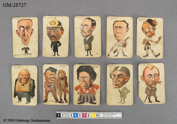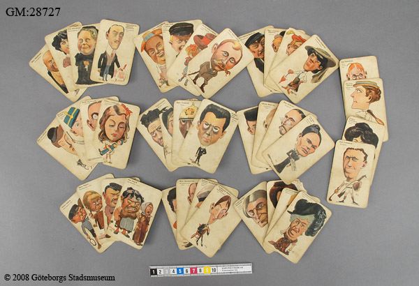 spelkort, 40 st, "Löjliga familjerna" ur Strix. Karikatyrartade bilder av figurer, 4 medlemmar ur "varje familj". Anspelningar på kända personer tex. Fru Prata Skralström = Kata Dahlström då en känd jämställdhetförespråkare bla i rösträttsfrågan.