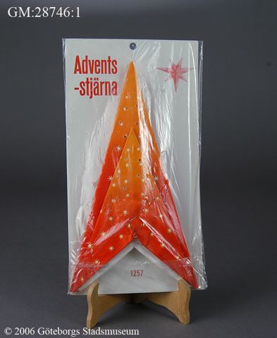 - Två stycken adventsstjärnor av papper och metall, den ena är ihopvikt och ligger i sin förpackning och den andra är monterad på lampsockel med sladd. Inskaffad till museet 1972.