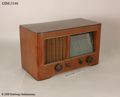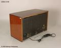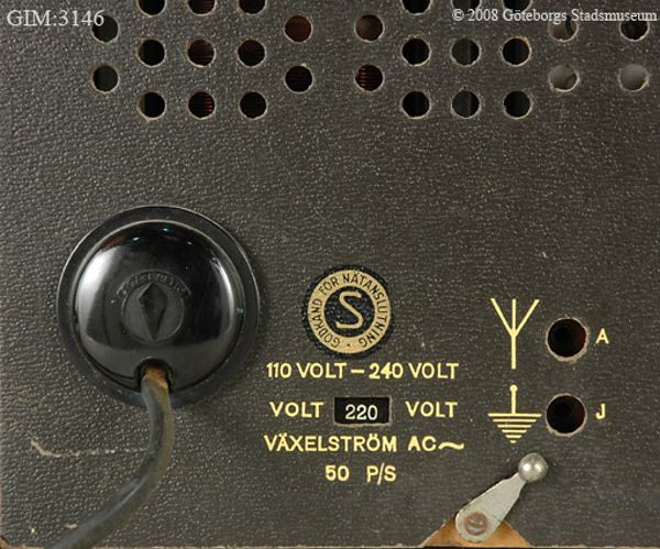 Brunt trächassie. LV-MV-KV. Bakelitreglage. Tygövertäckt högtalare på front. Stationsskala i glas. Skador: Kraftig tejpskada på topp. Div små repor runtom. Nätsladd.