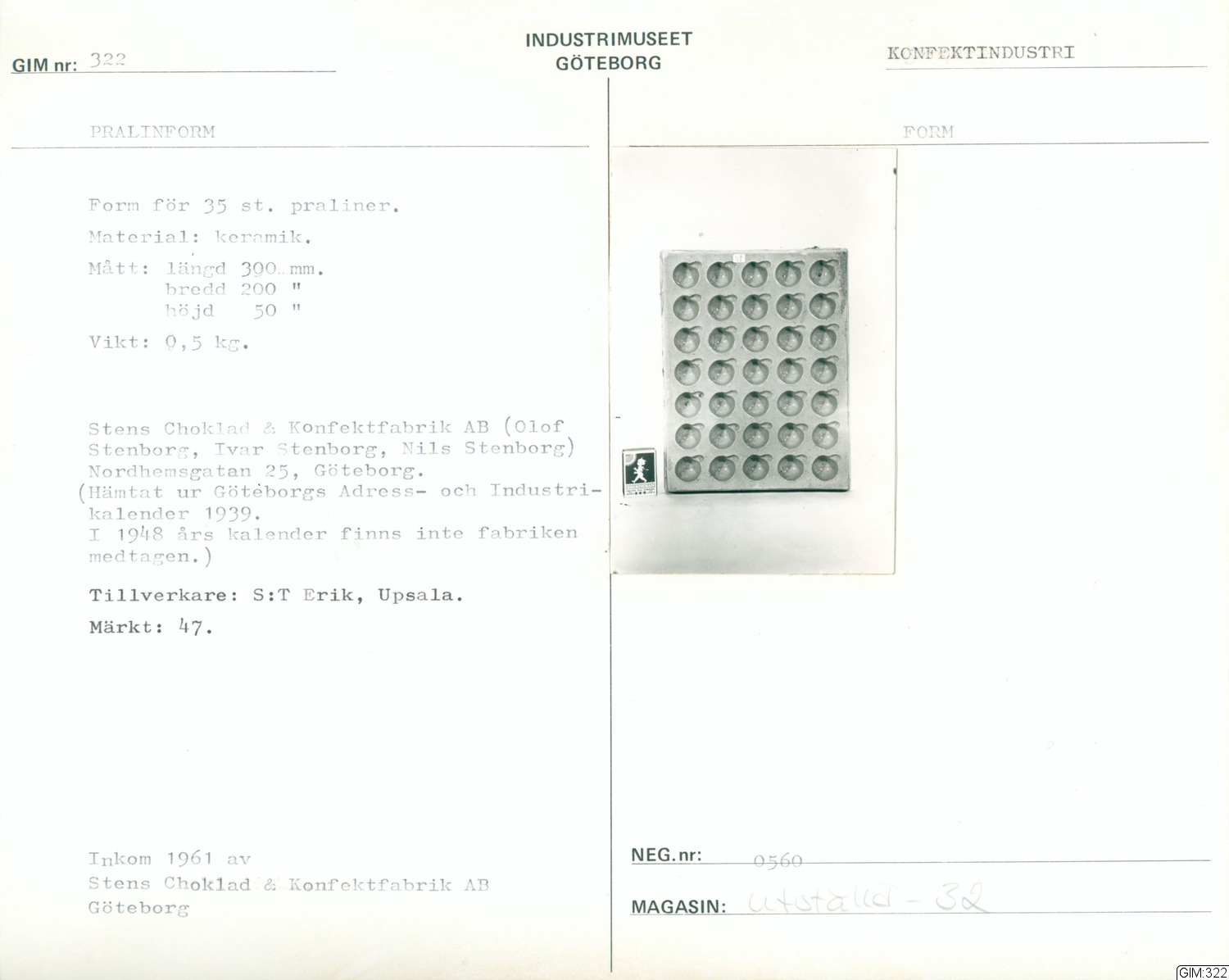 Glaserad, för 35 st praliner, 7 rader med 5 formar i varje, formen märkt 47; tillverkning S:t Erik Uppsala
