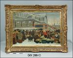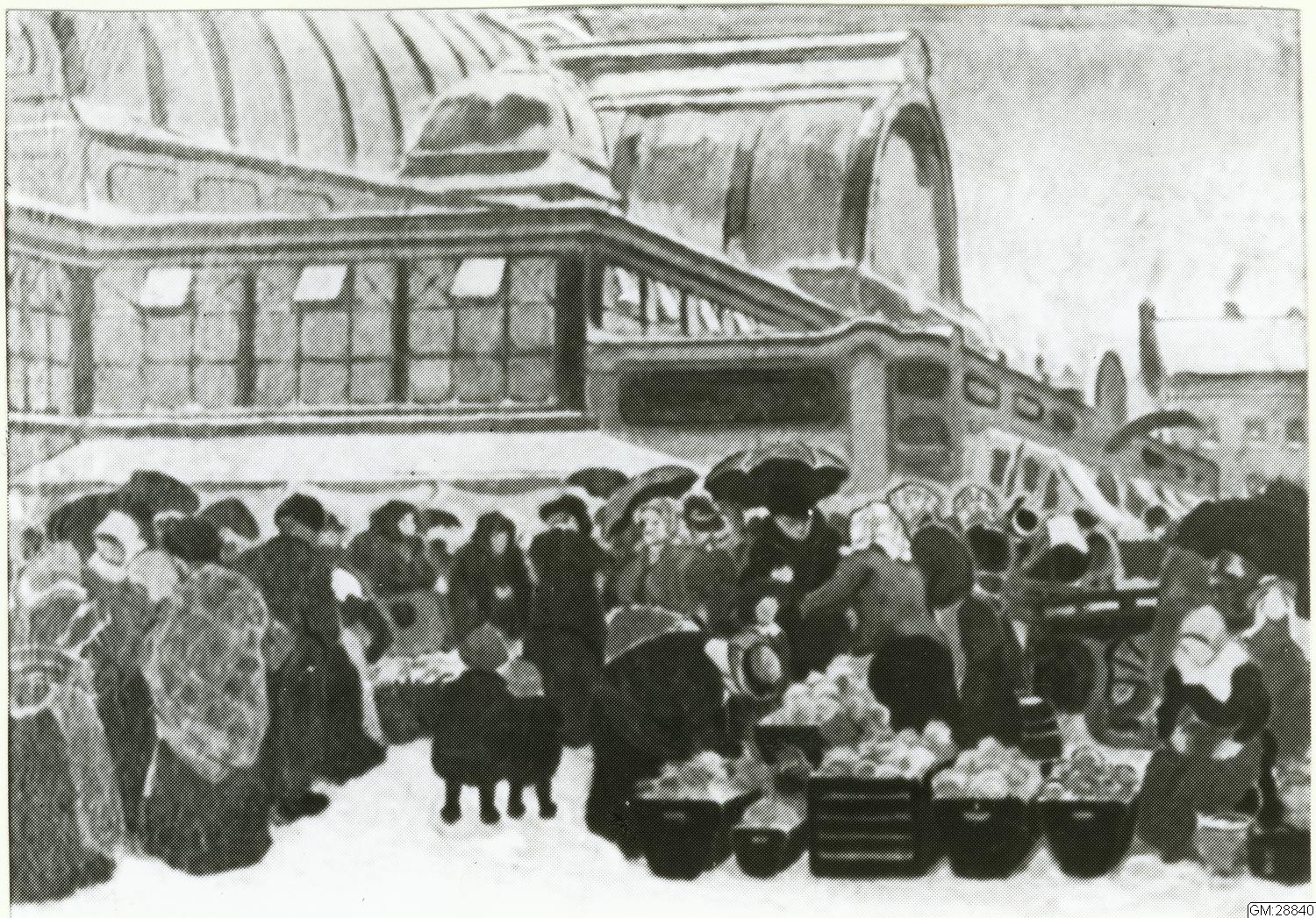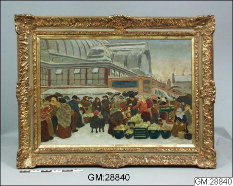 Torghandel utanför Saluhallen vid Kungstorget. Olja på pannå