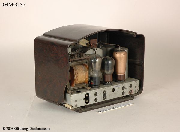 - Rundradiomottagare rörbestyckad LV - MV. Brunt bakelitchassie. Stationsskala i plast. Bakelitreglage. Skador: Bakstycke saknas. Bit av chassie borta på höger sida. Smårepor runt om.