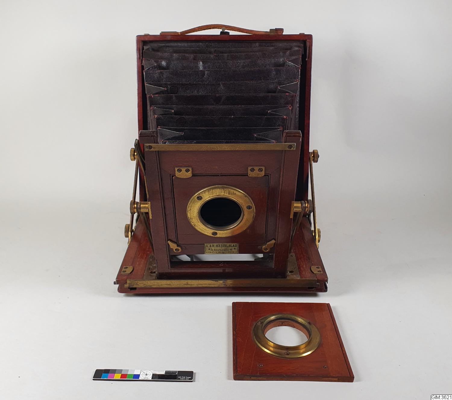 bälgkamera i trä och mässing resekamera skylt: G&H Hasselblad Östra Hamngatan 46 Göteborg säljare eller tillverkare ?#bakstycke med mattskiva, saknar objektiv#