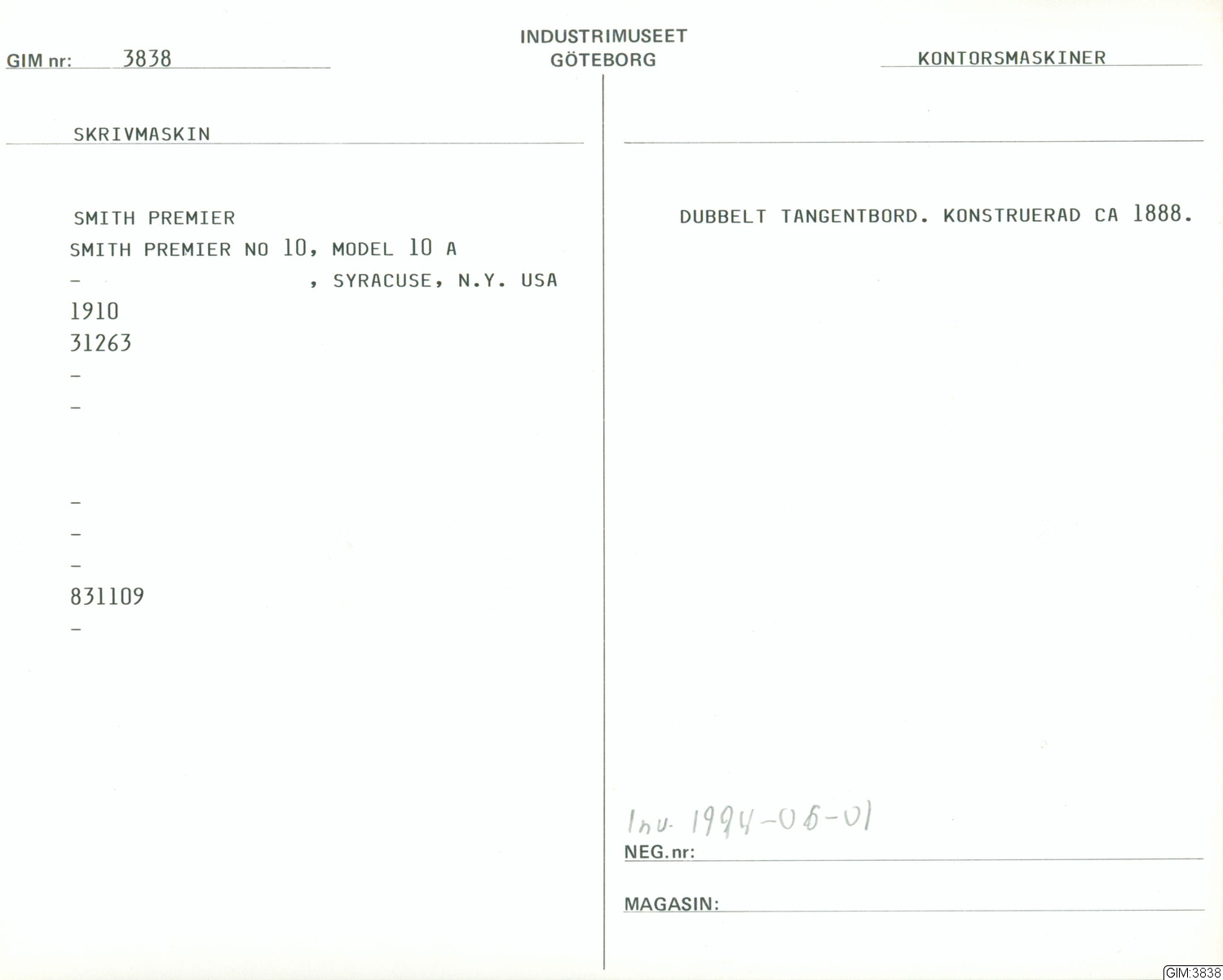 GIM:3838 :: skrivmaskin, skrivmaskin, "Smith Premier" 10