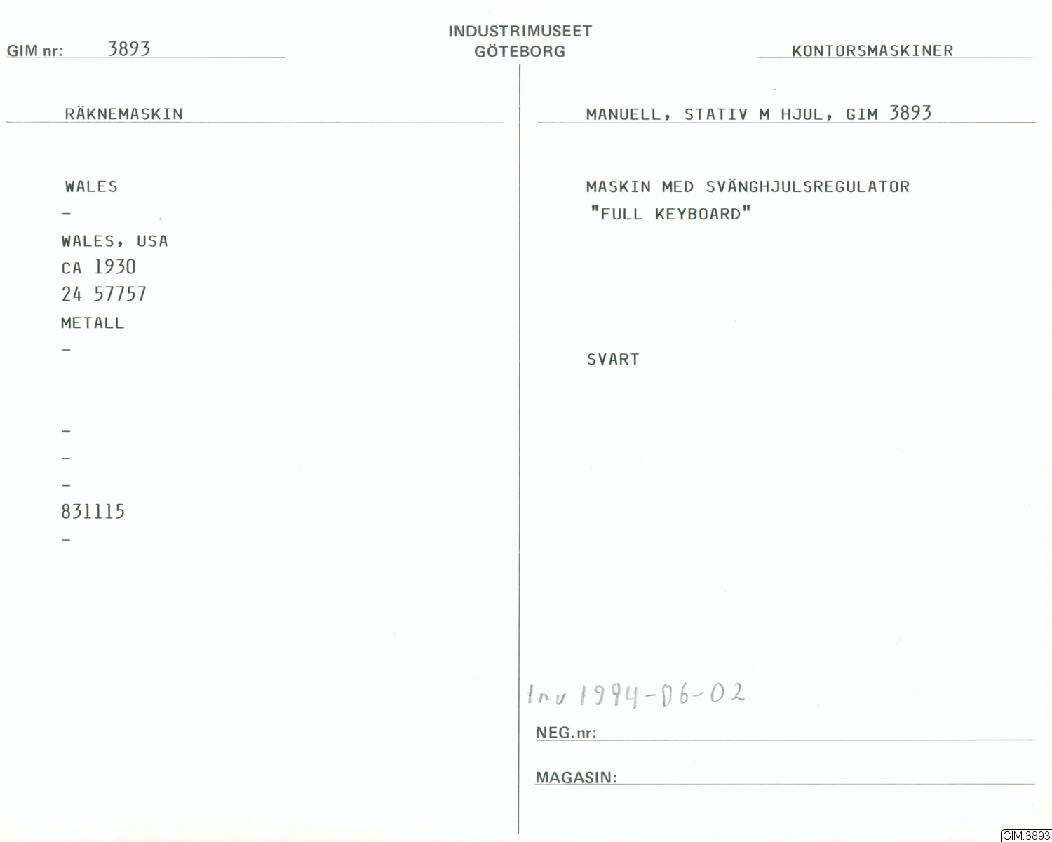 Maskin med svänghjulsregulator. "Full key-board".Manuell.; tillverkning: Wales, USA