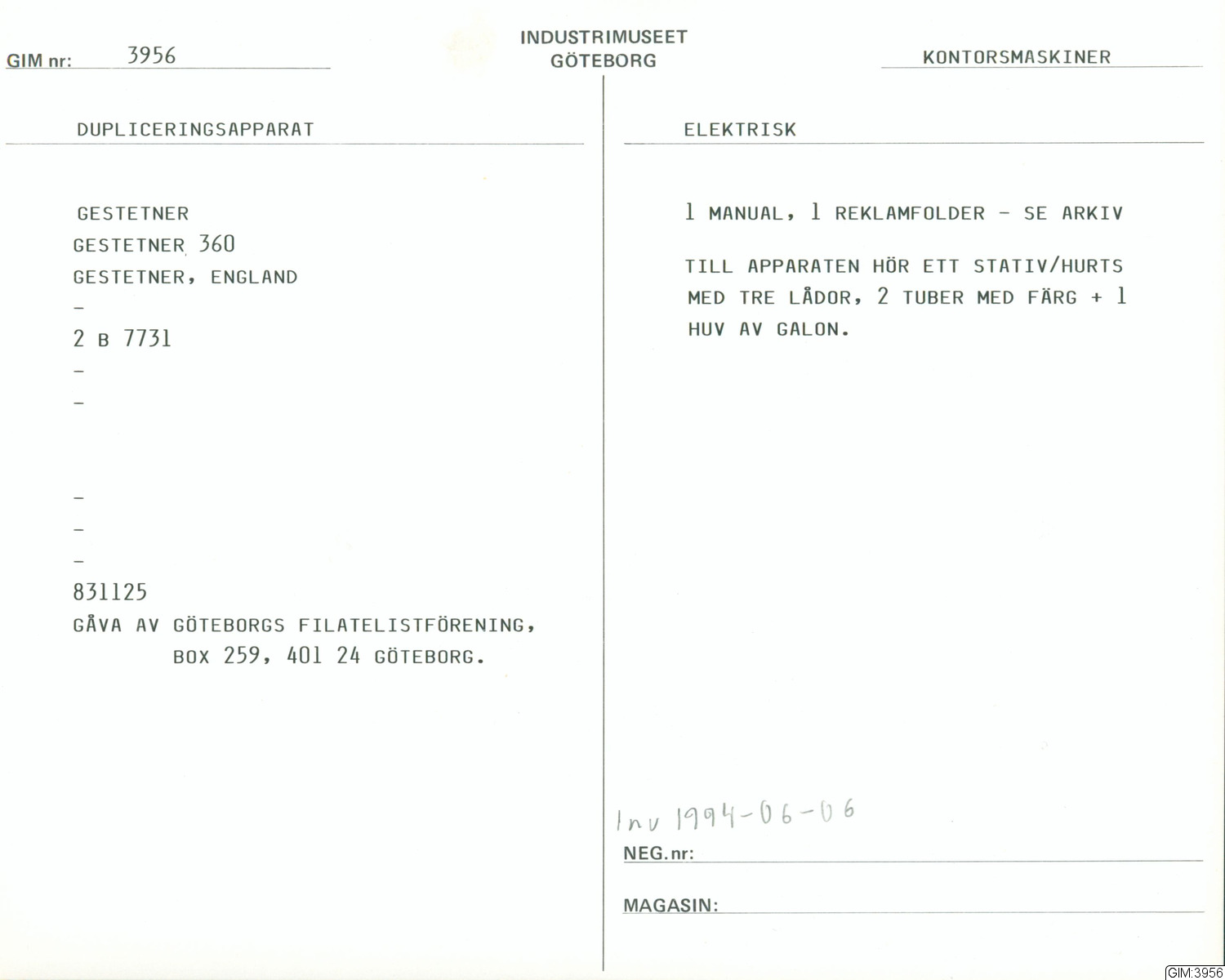 - Dupliceringsapparat Gestetner. Till apparaten hör stativ/hurts med tre lådor, 2 tuber med färg samt 1 huv av galon.