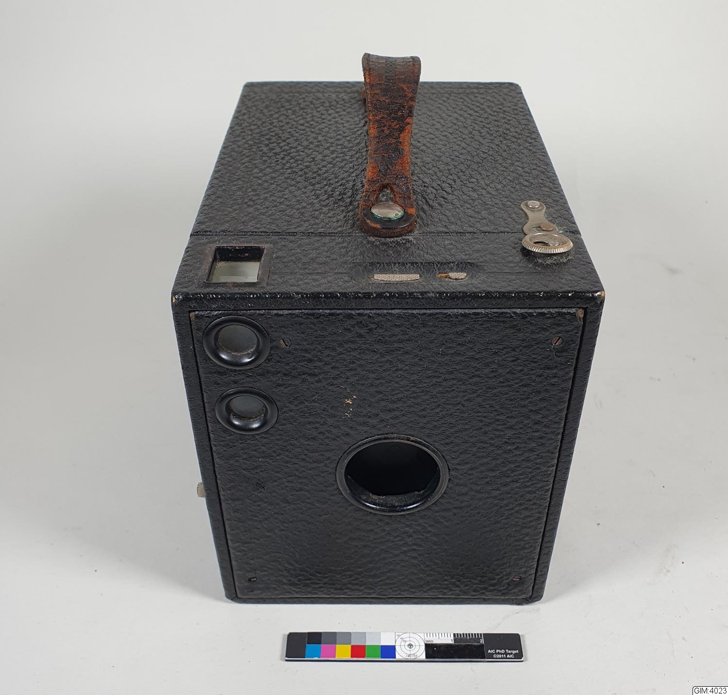 Svart lådkamera.