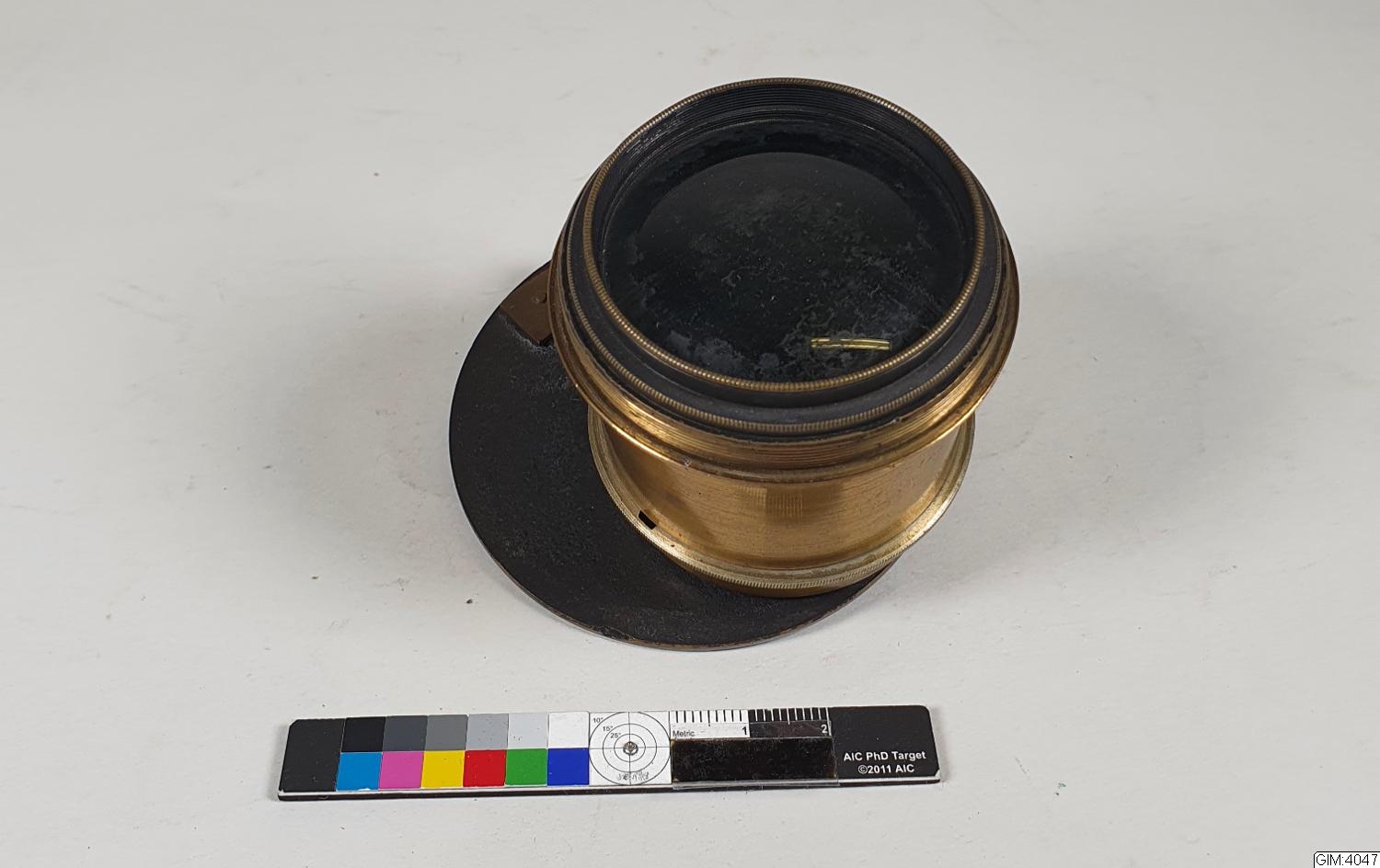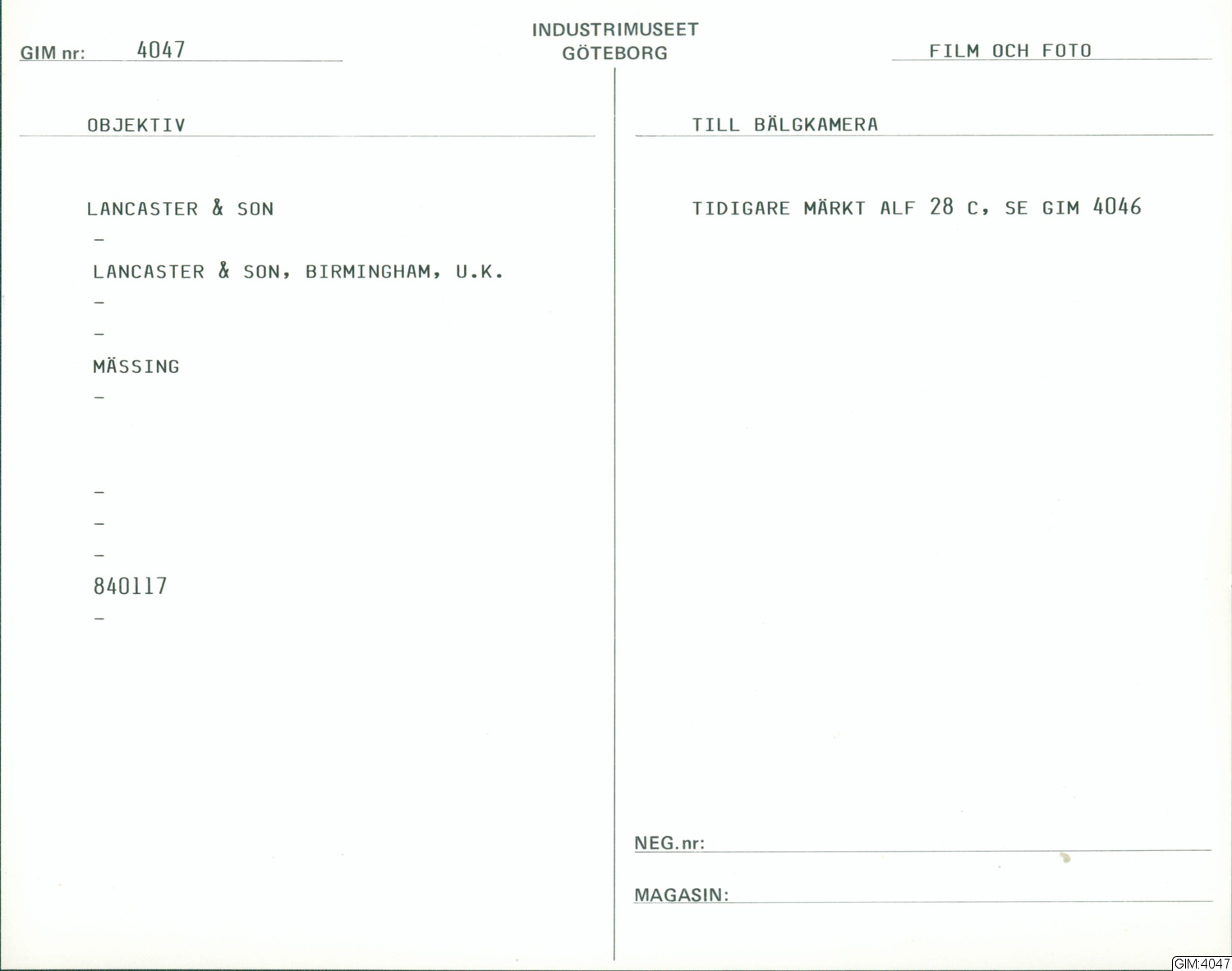 obj till bälgkamera fastskruvat på sep platta med bländarmekanism märkt Lancaster's patent.
