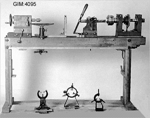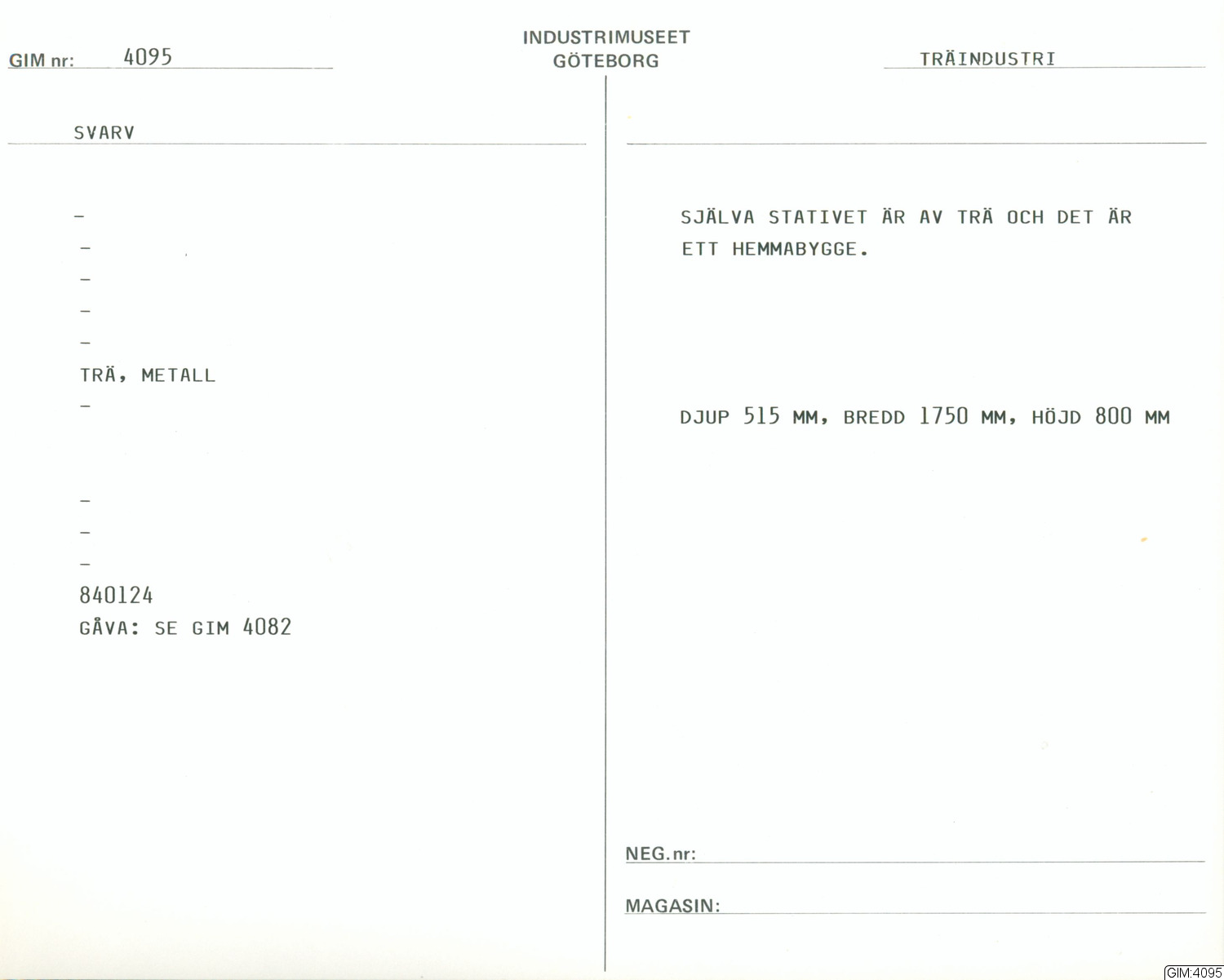 - Själva stativet är av trä och det är ett hemmabygge. Delar till svarven gjorda av trä ligger i en pappkartong. 3 st detaljer av järn som tillhör svarven finns också, troligtvis hållare. En trasig och sliten kilrem. se GIM 4082. Två trälådor med detaljer.