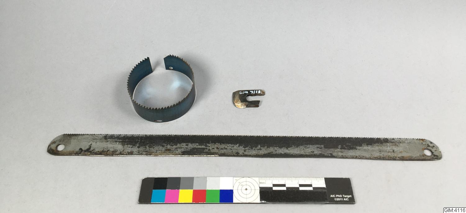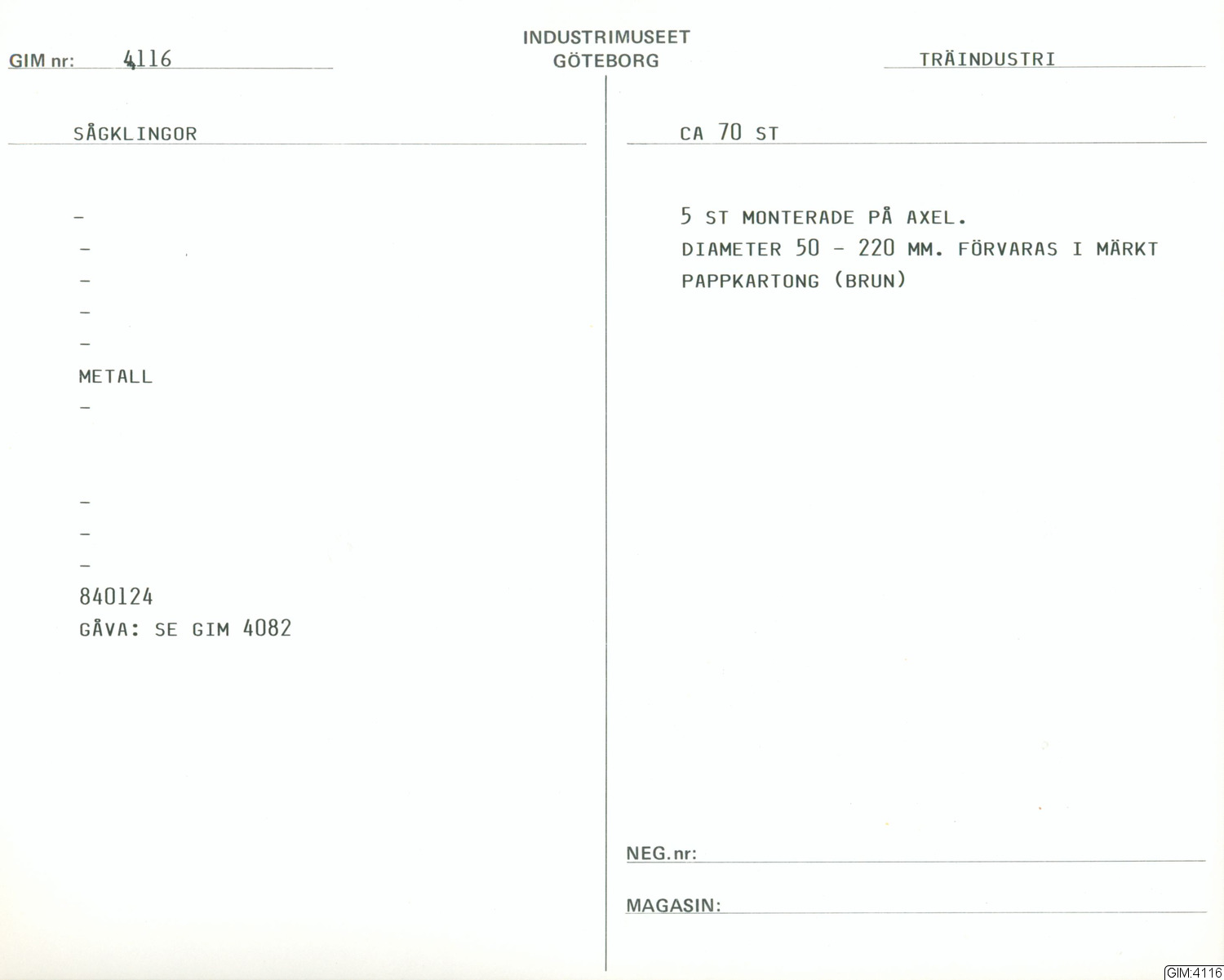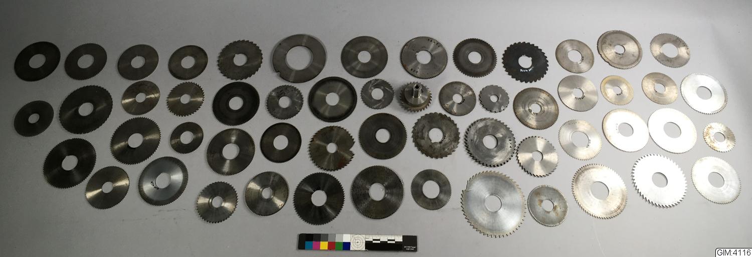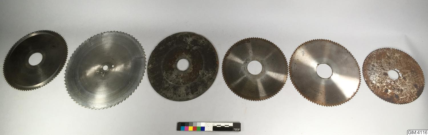 - 5 st monterade på axel , 1st bågfilsblad , 1st cirkulärt sågblad , 1st litet skavstål utan skaft 76 st sågklingor: 4st trasig, 2st korrederade, 6st från Sandvik 1st från Malcus , 1st AB Kronsågar , 1st från AB Sågbladsfabriken , Nora . 1st Fagersta Bruk A
