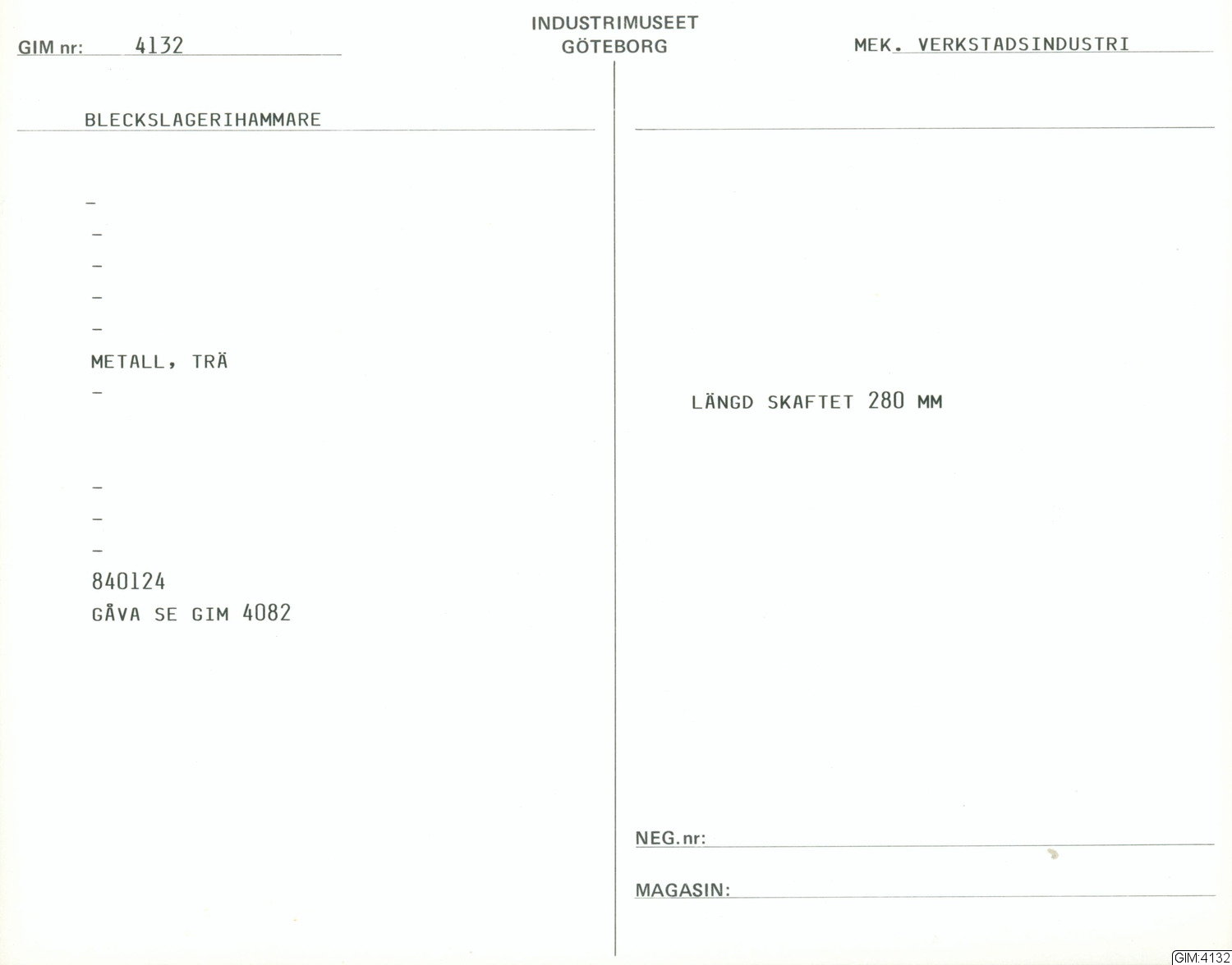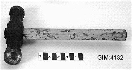- Bleckslagerhammare av gjutjärn , och skaft av trä. Inristat nr 50 på hammaren och en symbol på andra. Den föreställer en ring med två pilar som går rakt igenom. Hammarskaftet är trasigt. Hammaren sitter löst.