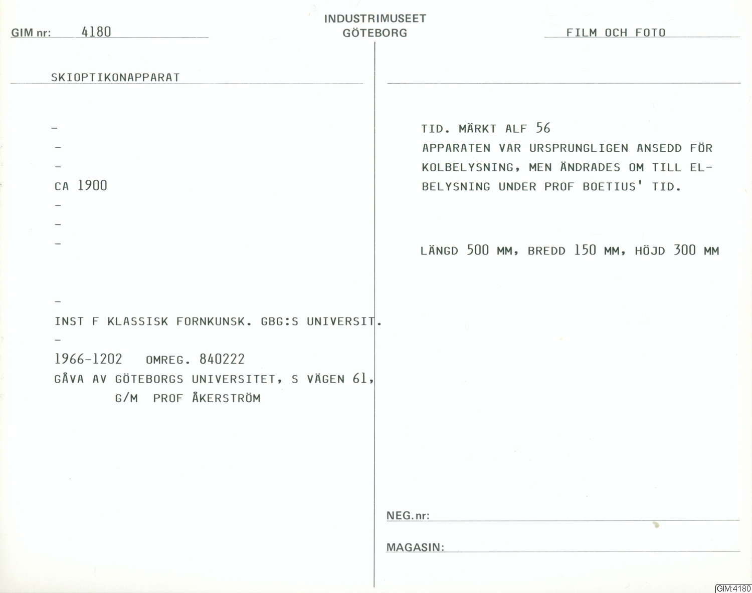 Apparaten är troligen från omkring 1900-talet. Den var ursprungligen avsedd för kolbelysning, men ändrades om till elektrisk belysning under prof. Axel Boëthius tid.