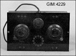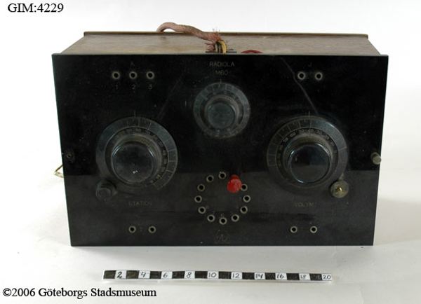 - Rundradiomottagare rörbestyckad. Brunt trächassi. Bakelitfront. Vidhängande kabel. LV - MV. Skador: smårepor runt om. Tejpskada höger sida.##