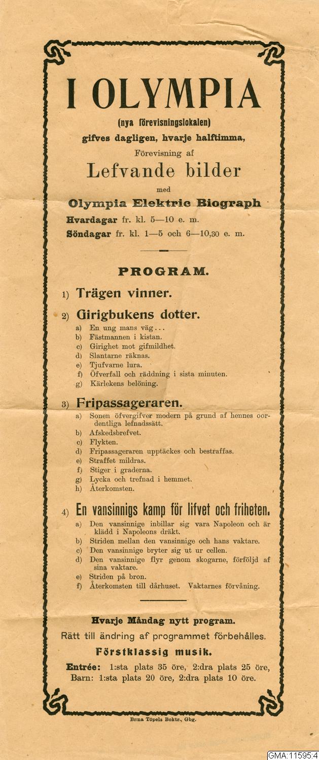Annons från Biografen Olympia, Program; 1 Trägen vinner, 2 Girigbukens dotter. 3 Fripassageraren 4 En vansinnigs kamp för lifvet och friheten.