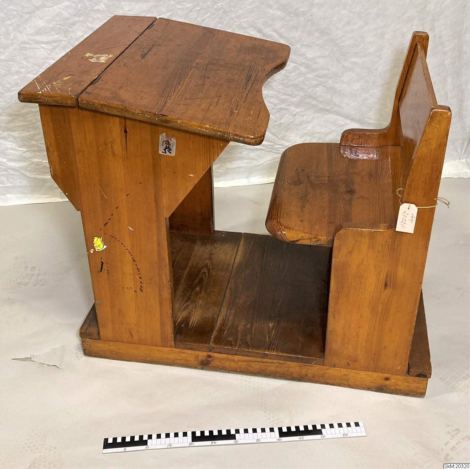 skolbänk, ensits, fast stol, brunbetsad furu, ca 1920-30-tal.