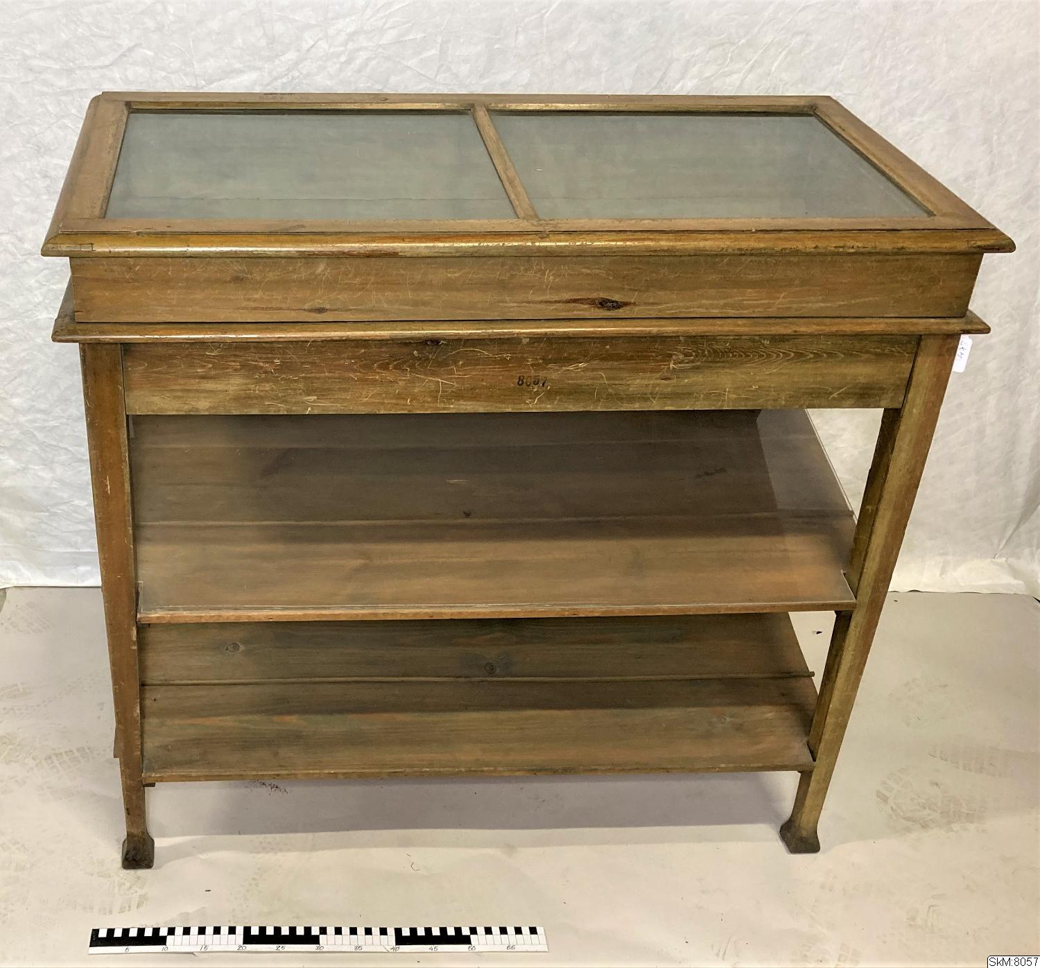 monter, av grönbetsat trä med glaslock, som enligt accessionskatalogen för skolsamlingen innehållit en mineralsamling.
