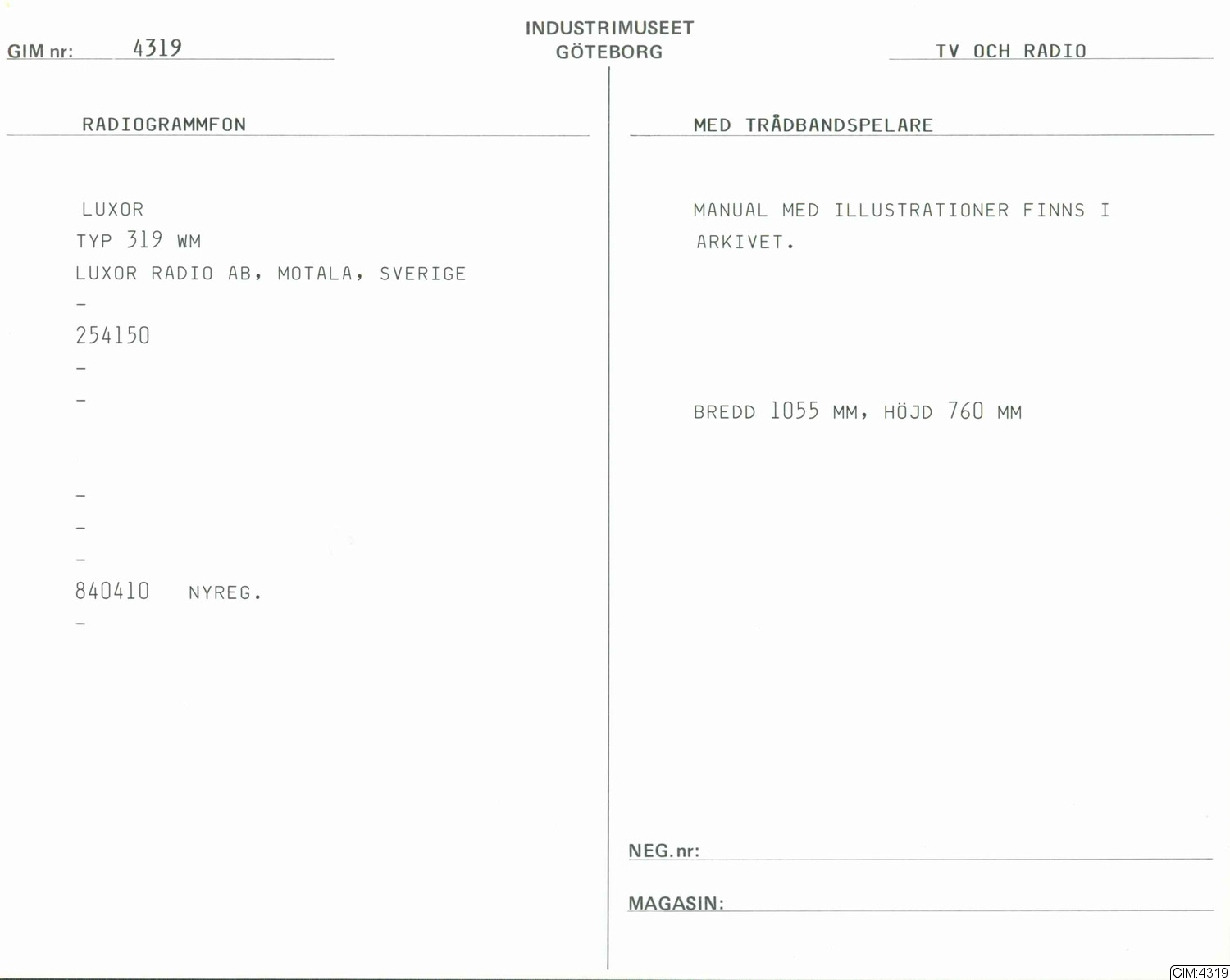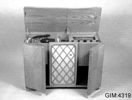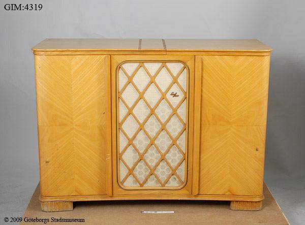 - Rundradiomottagare golvmodell. LV - MV - och fem kortvågsband. Rörbestyckad. Grammofon och trådbandspelare sk audiofon eller magnofon. Grammofon och radio finns under lock på ovansida. Högtalare och förvaringsskåp på fronten. Ljusbrunt trächassie. Stationsskala i glas.