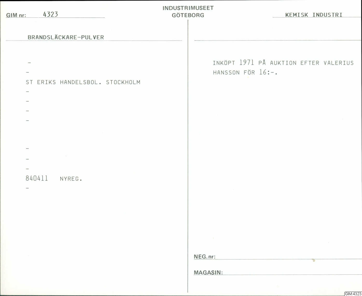 - Inköpt 1971 på auktion efter Valerius Hansson för 16:-. Pulversläckare.